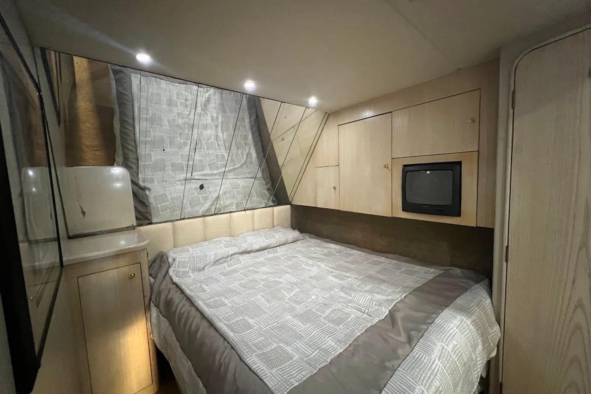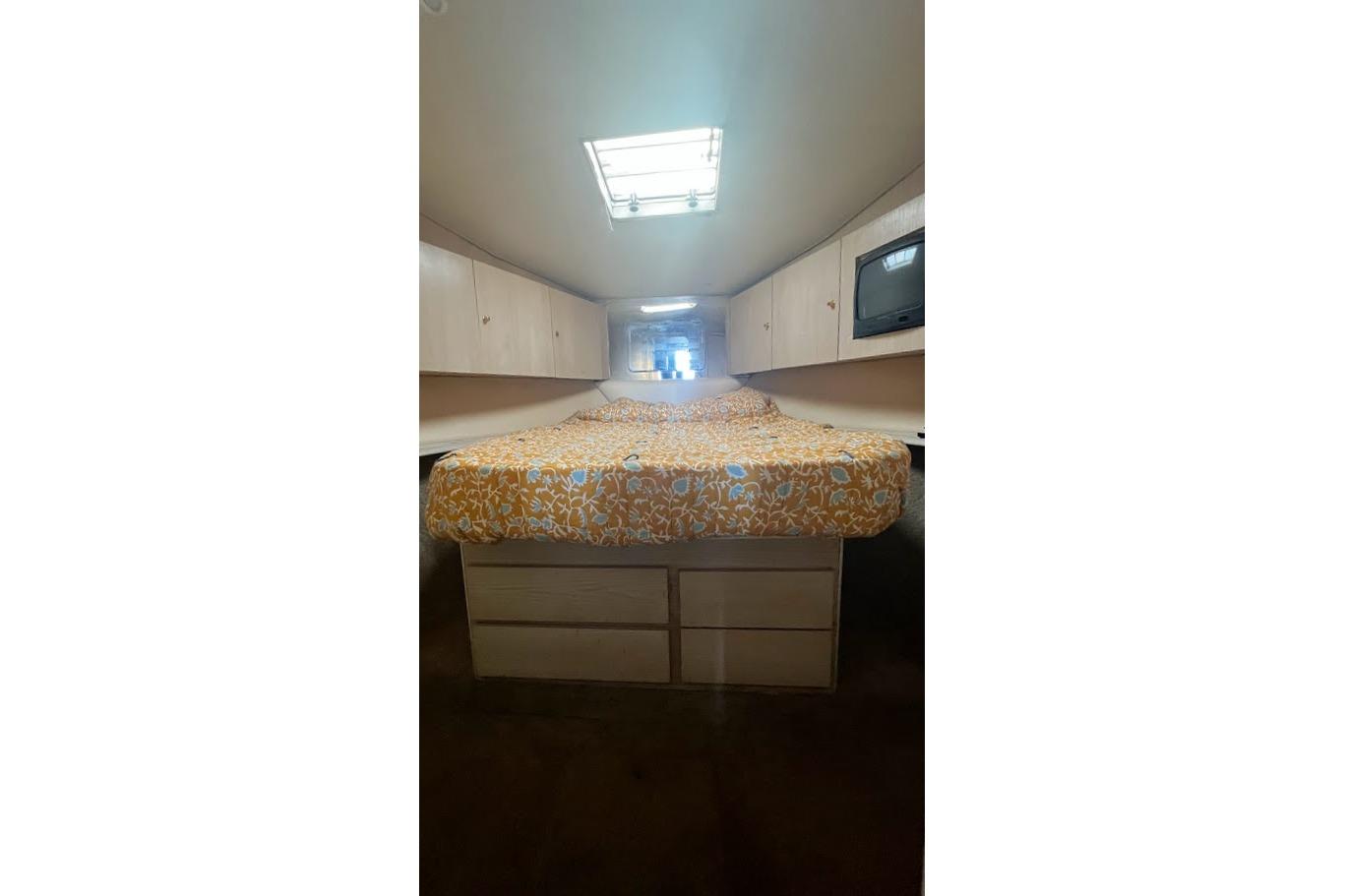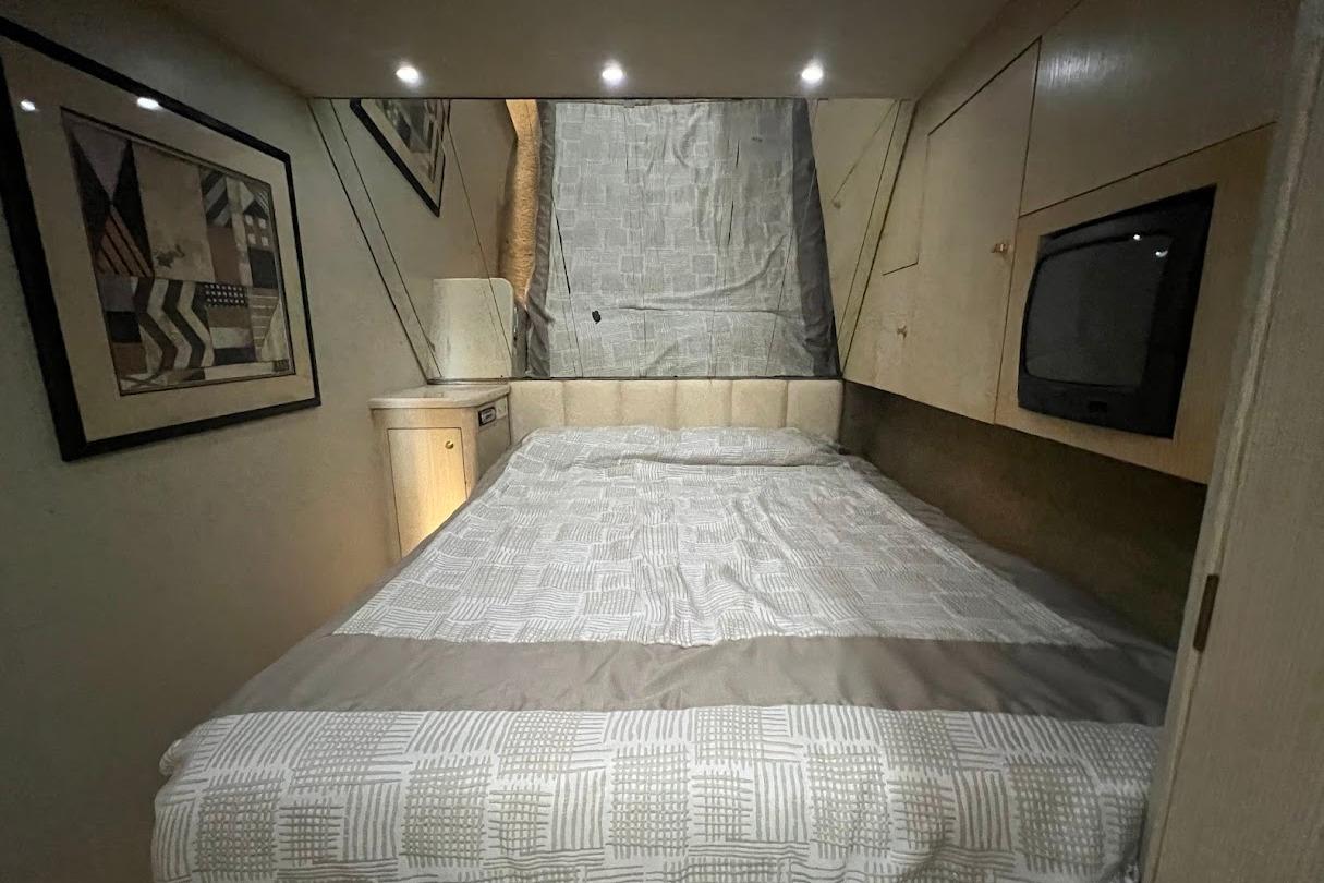 Guest Stateroom is forward with a Center line Queen Bed, hanging lockers and lot's of storage plus access to the guest head and shower