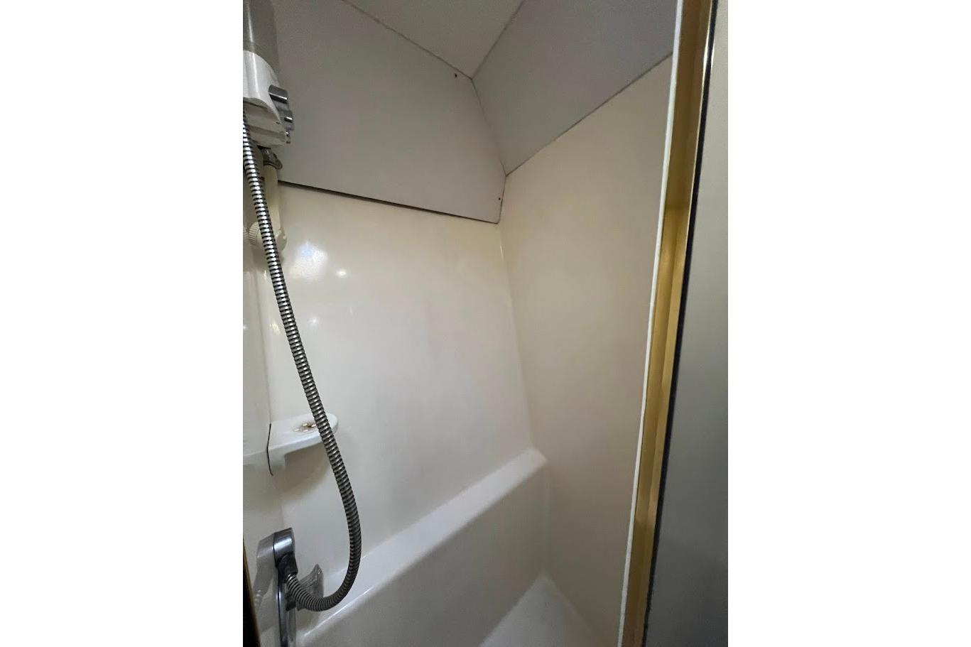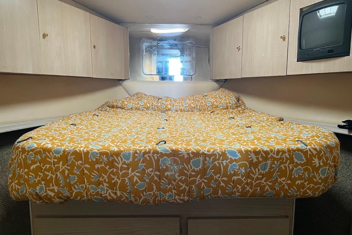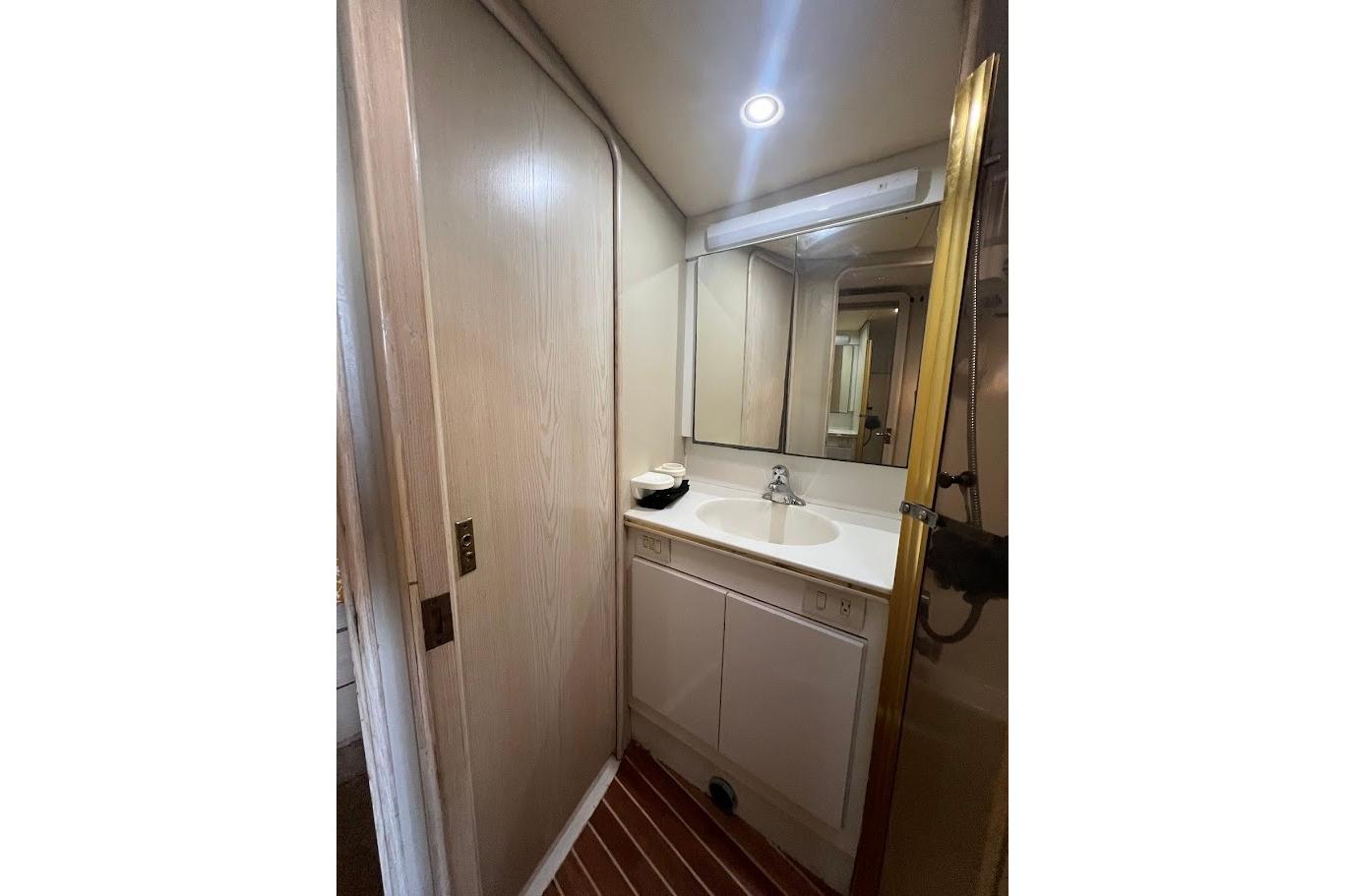 Guest Stateroom is forward with a Center line Queen Bed, hanging lockers and lot's of storage plus access to the guest head and shower