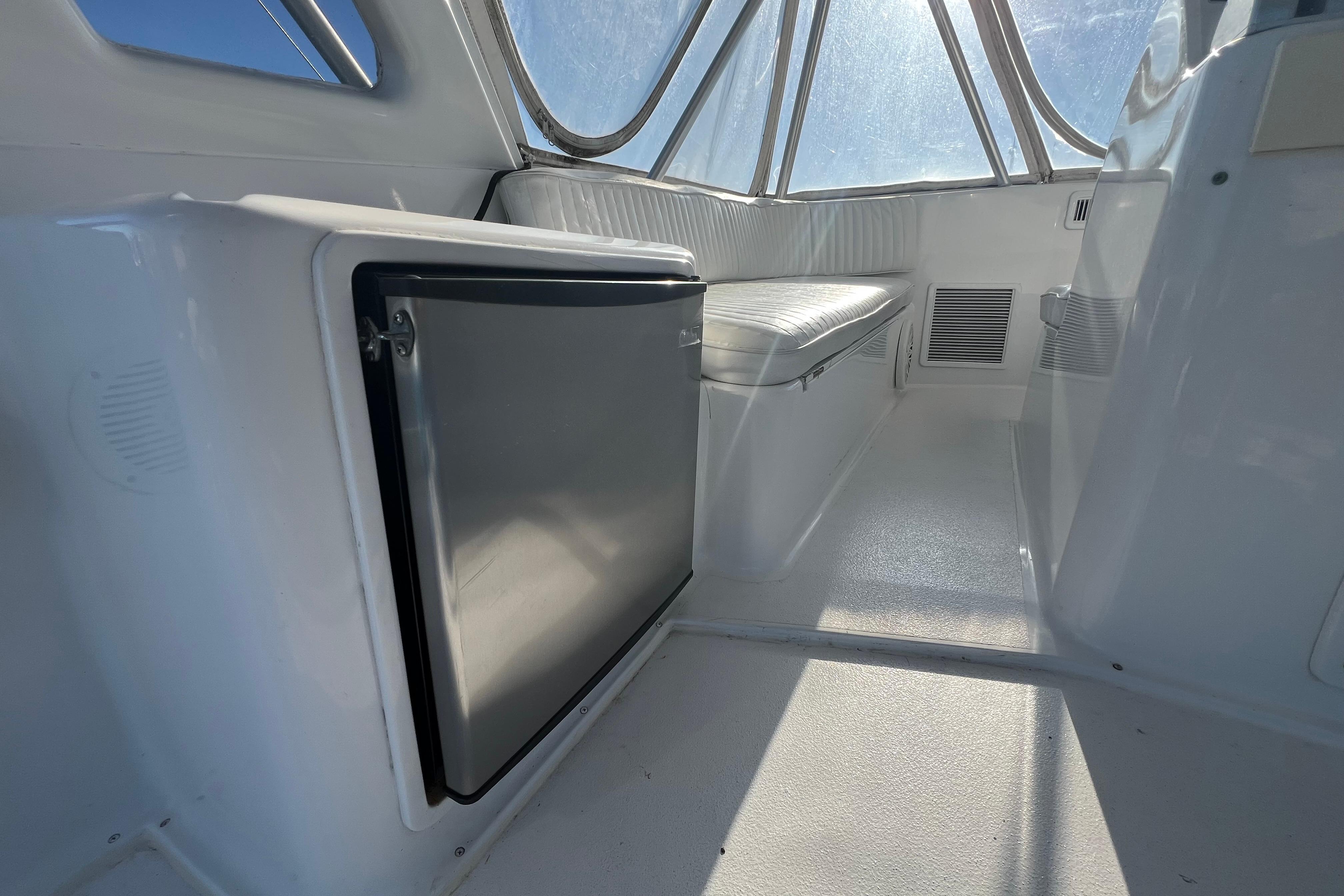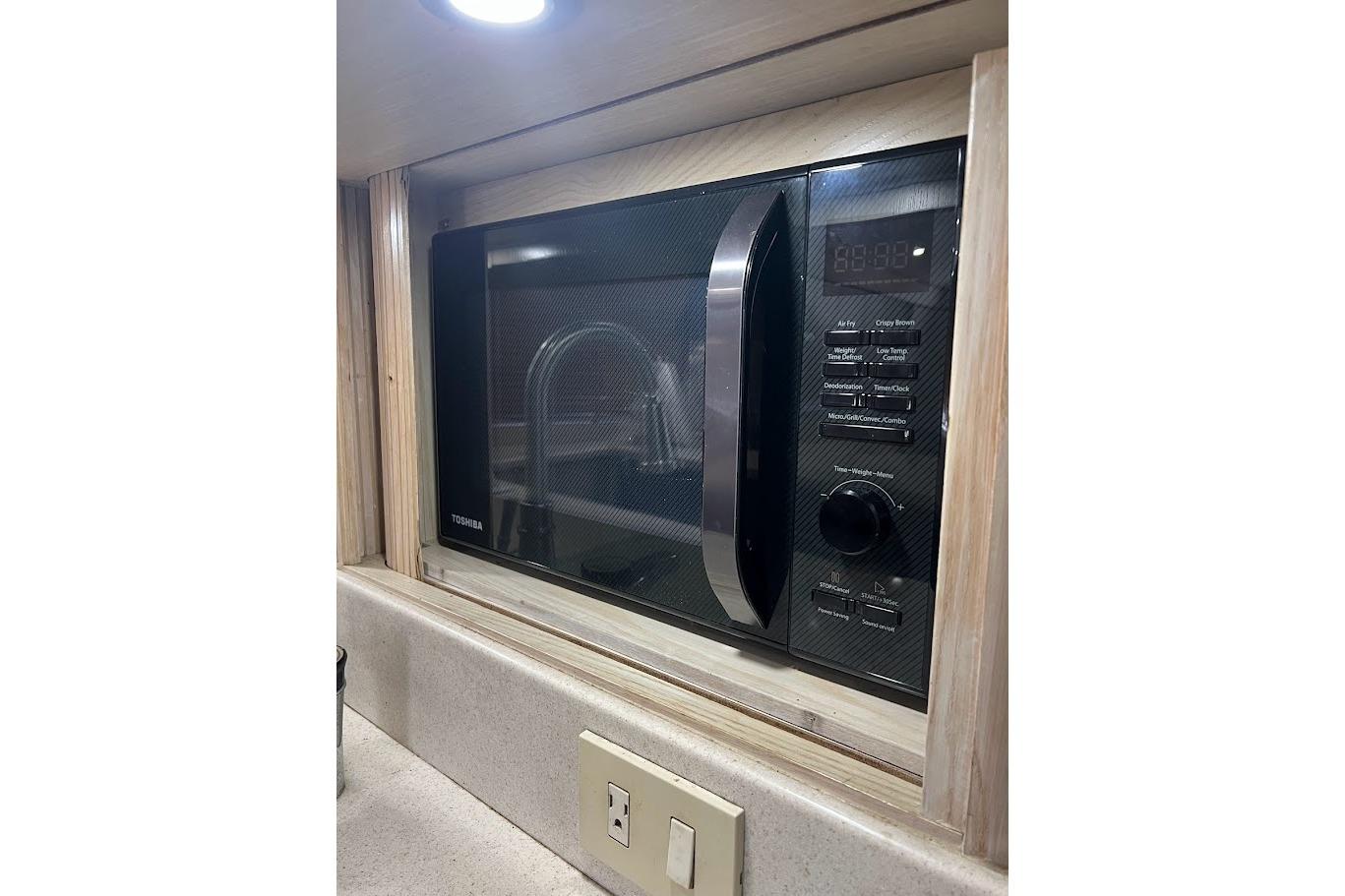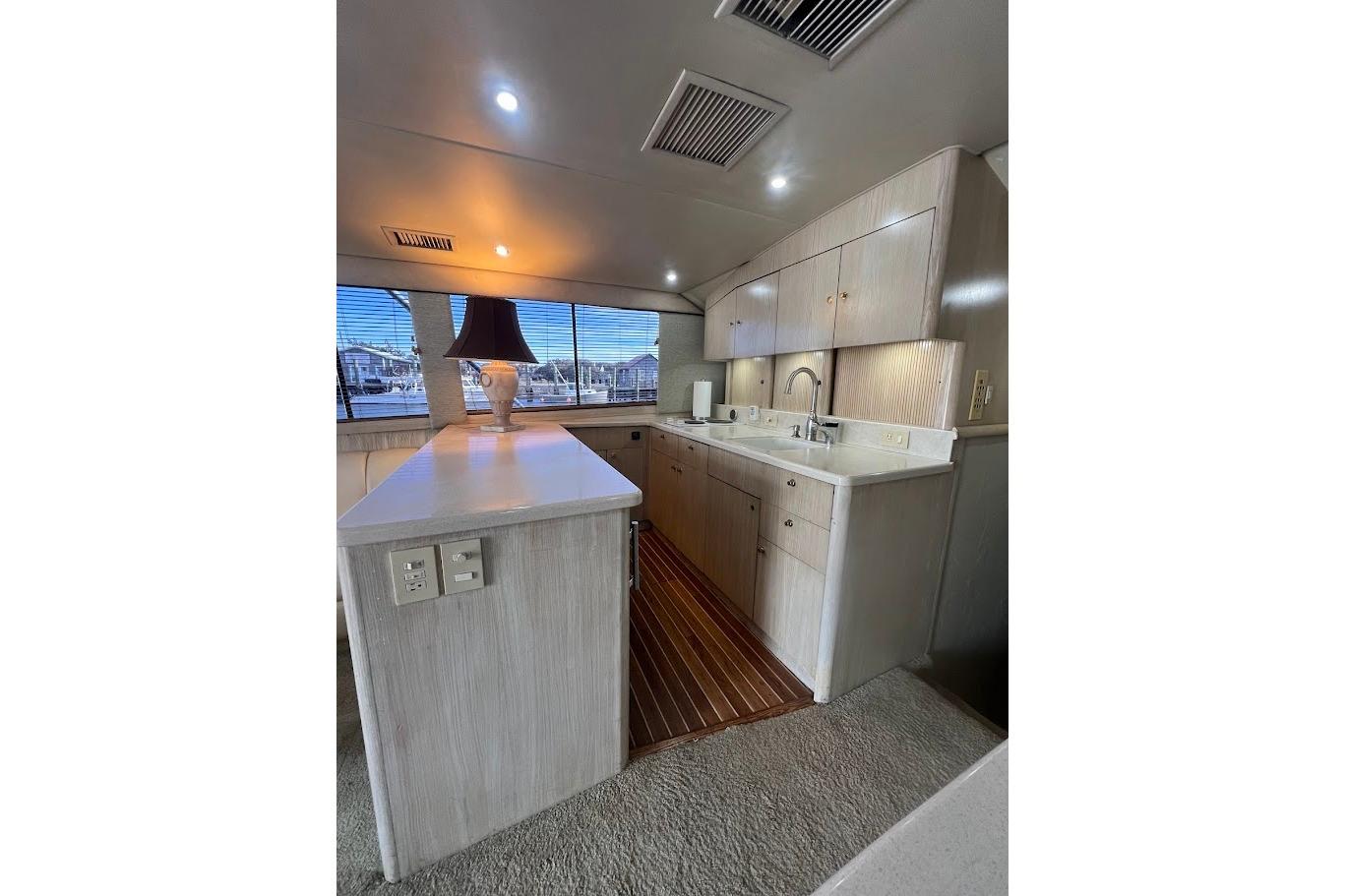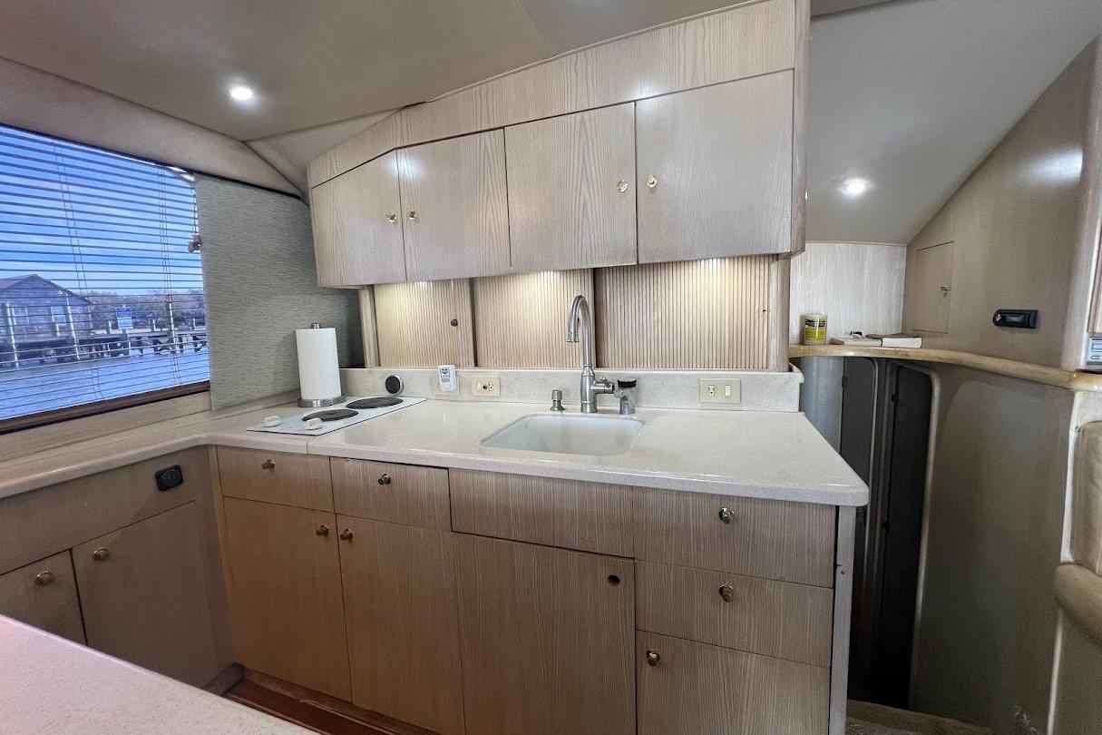 Galley up with Teak & Holly Flooring, under counter refrigerator and freezer and a two burner stove top. Lots of storage with large area under galley sole. There is a Dinette on the Starboard side and Convection Microwave