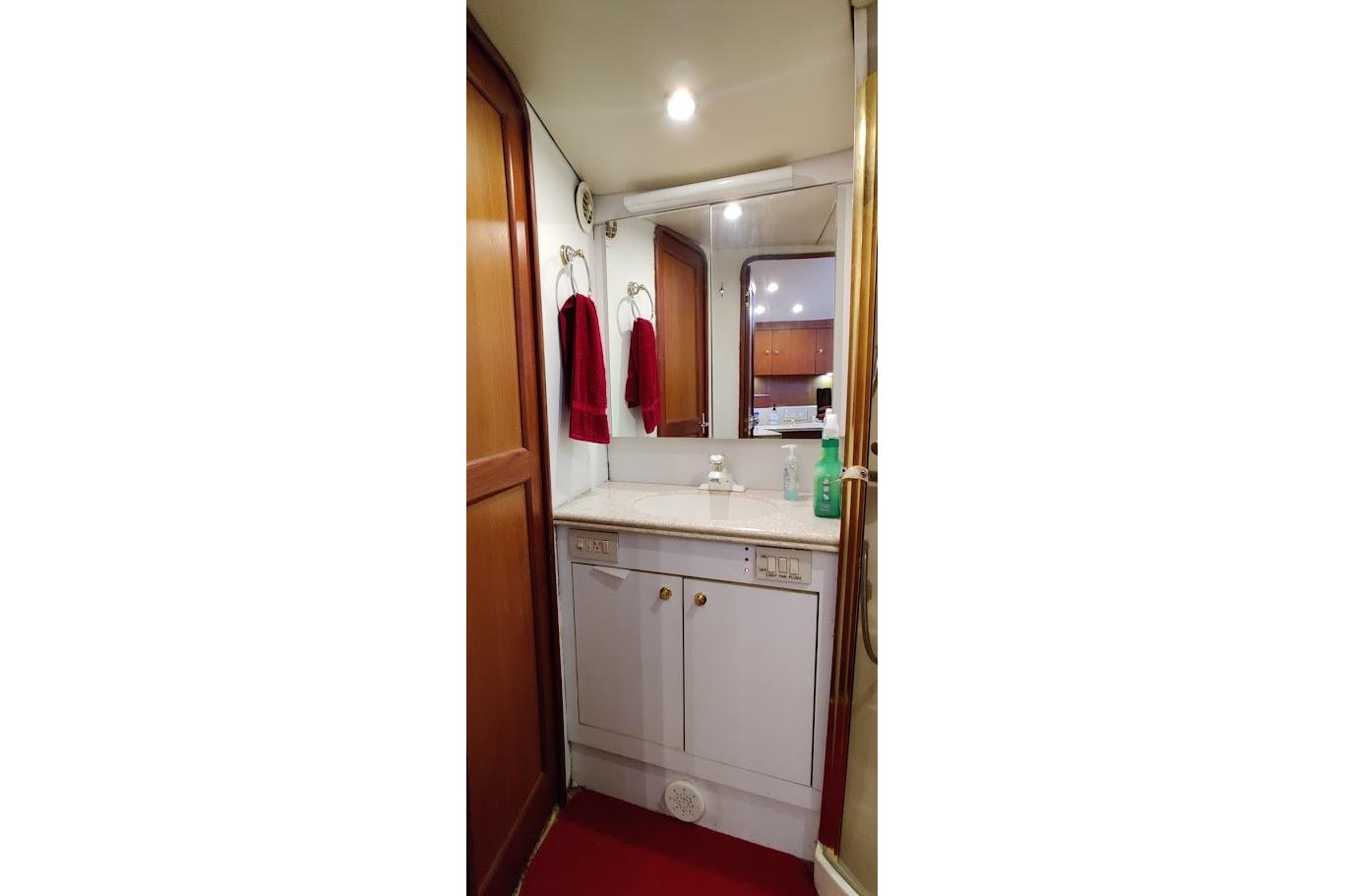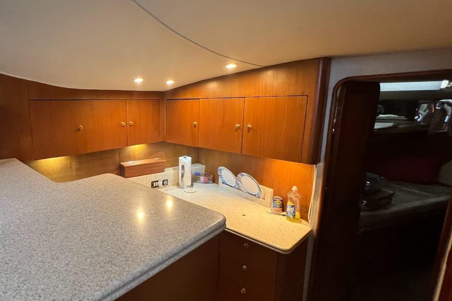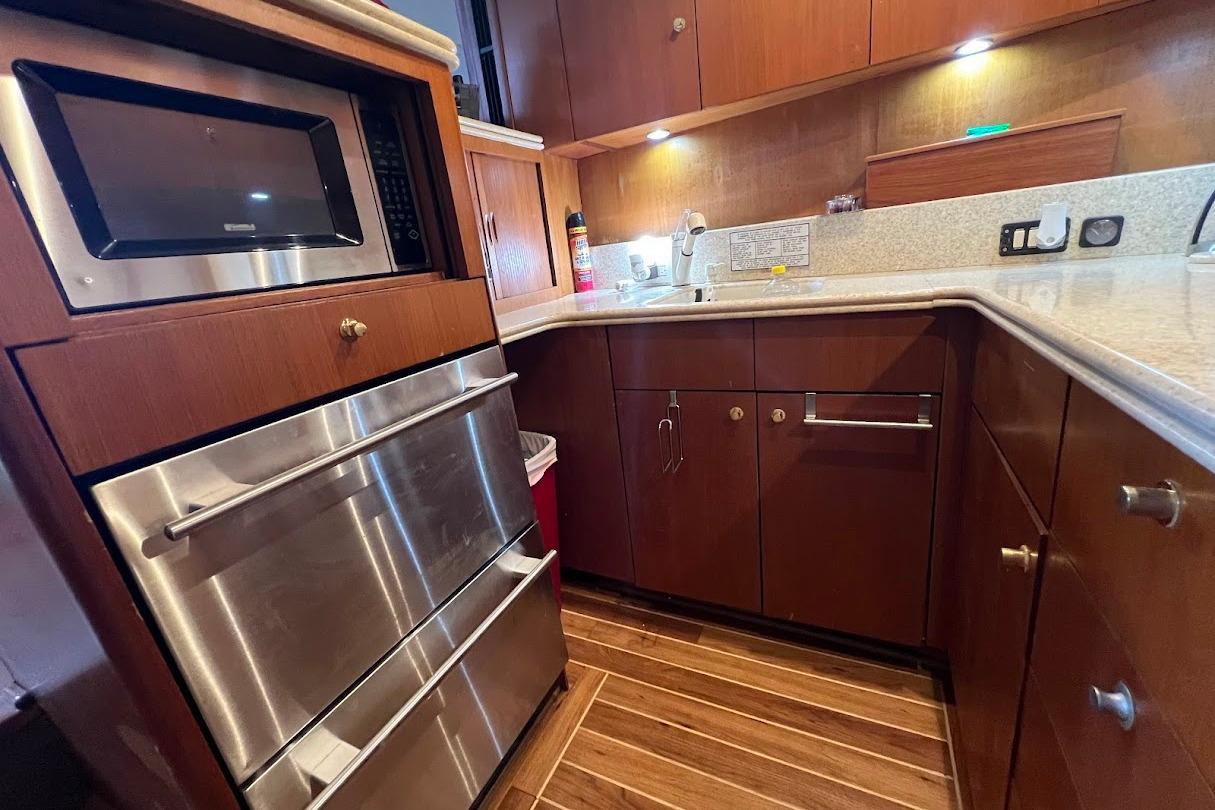 The salon seems shorter than on many comparably sized boats due to the aft cabin and the galley-down arrangement. Two steps down take you to a complete galley where a half-height refrigerator, microwave/convection oven and all the other luxury appliances live. A half-height freezer flanks the stairwell.