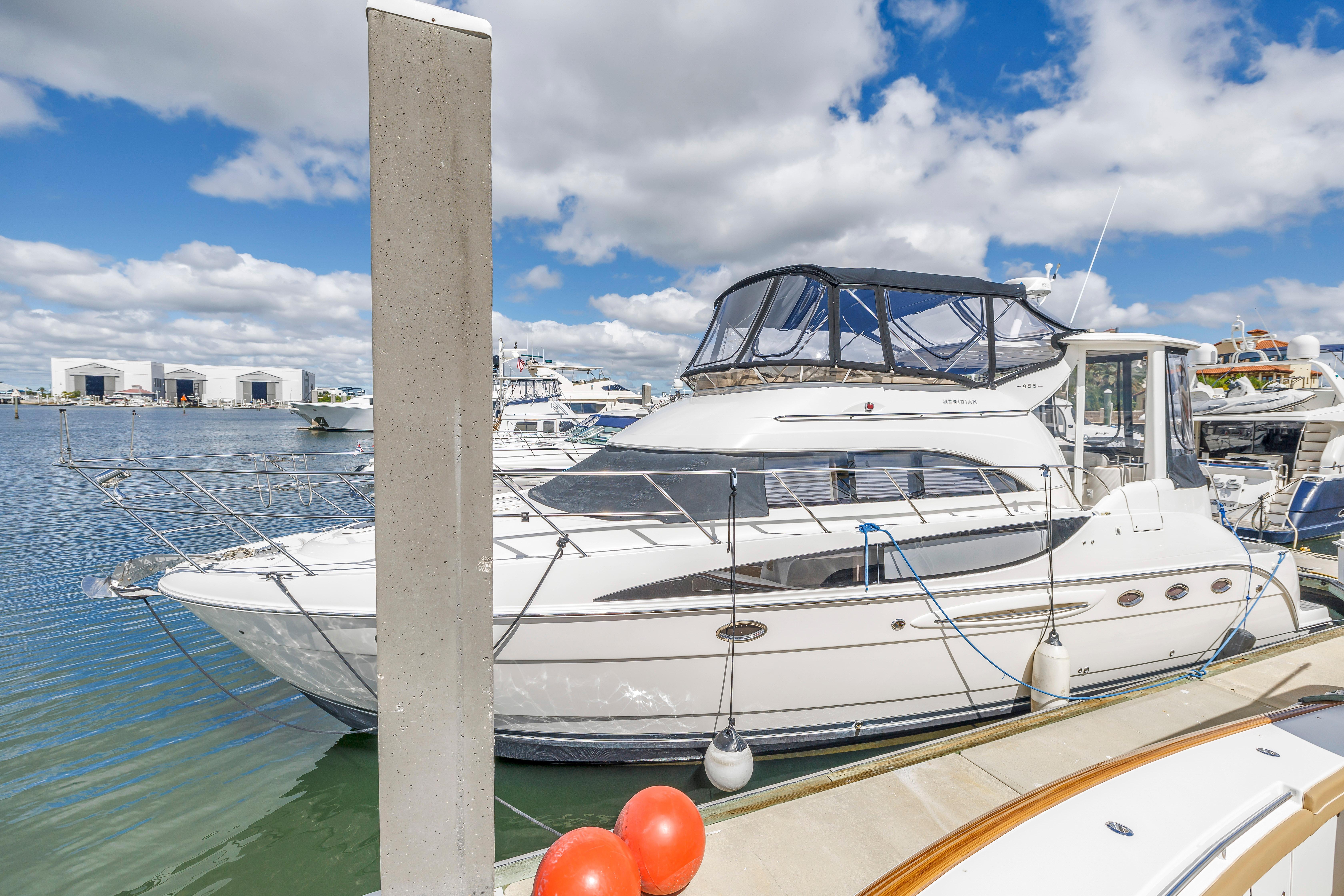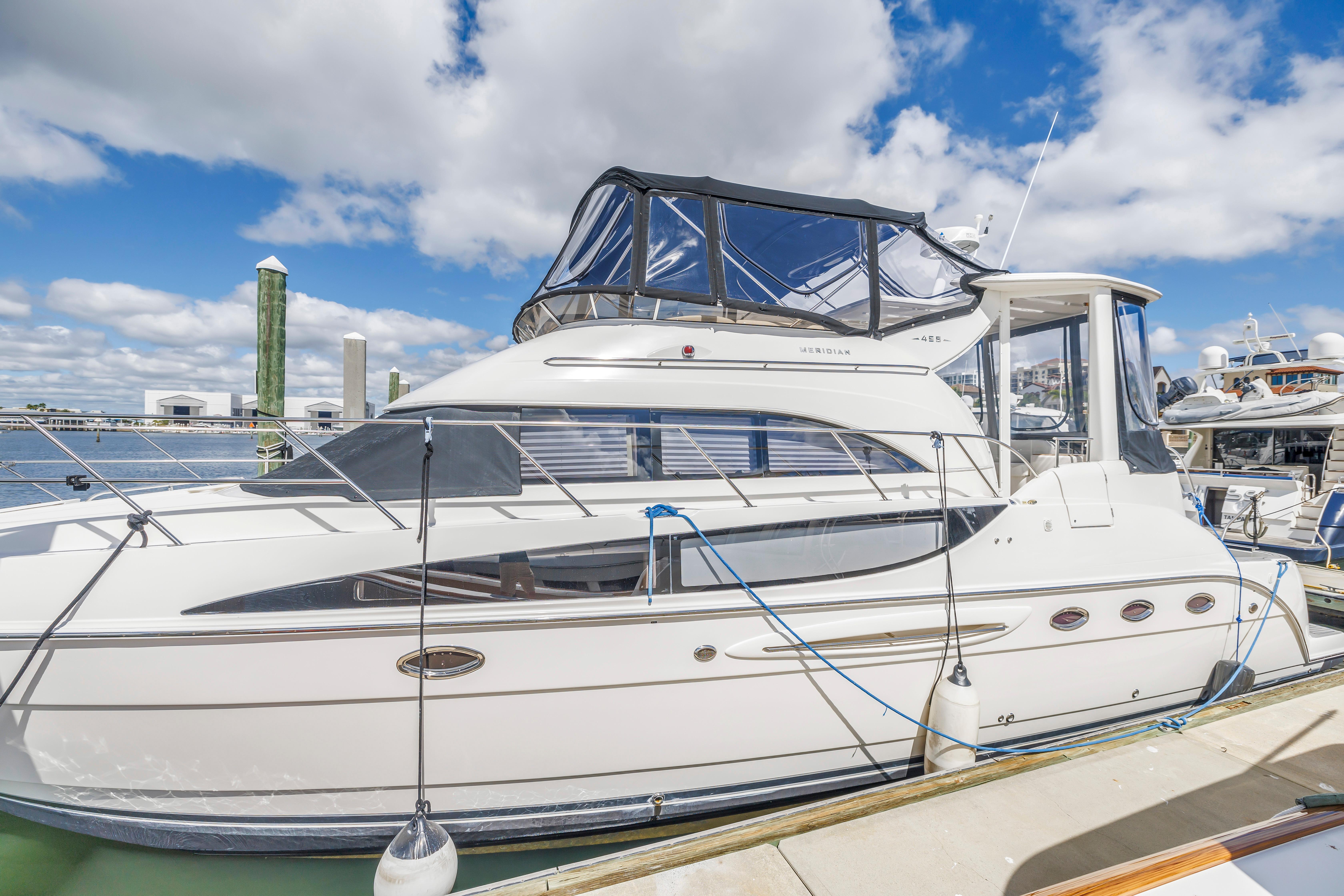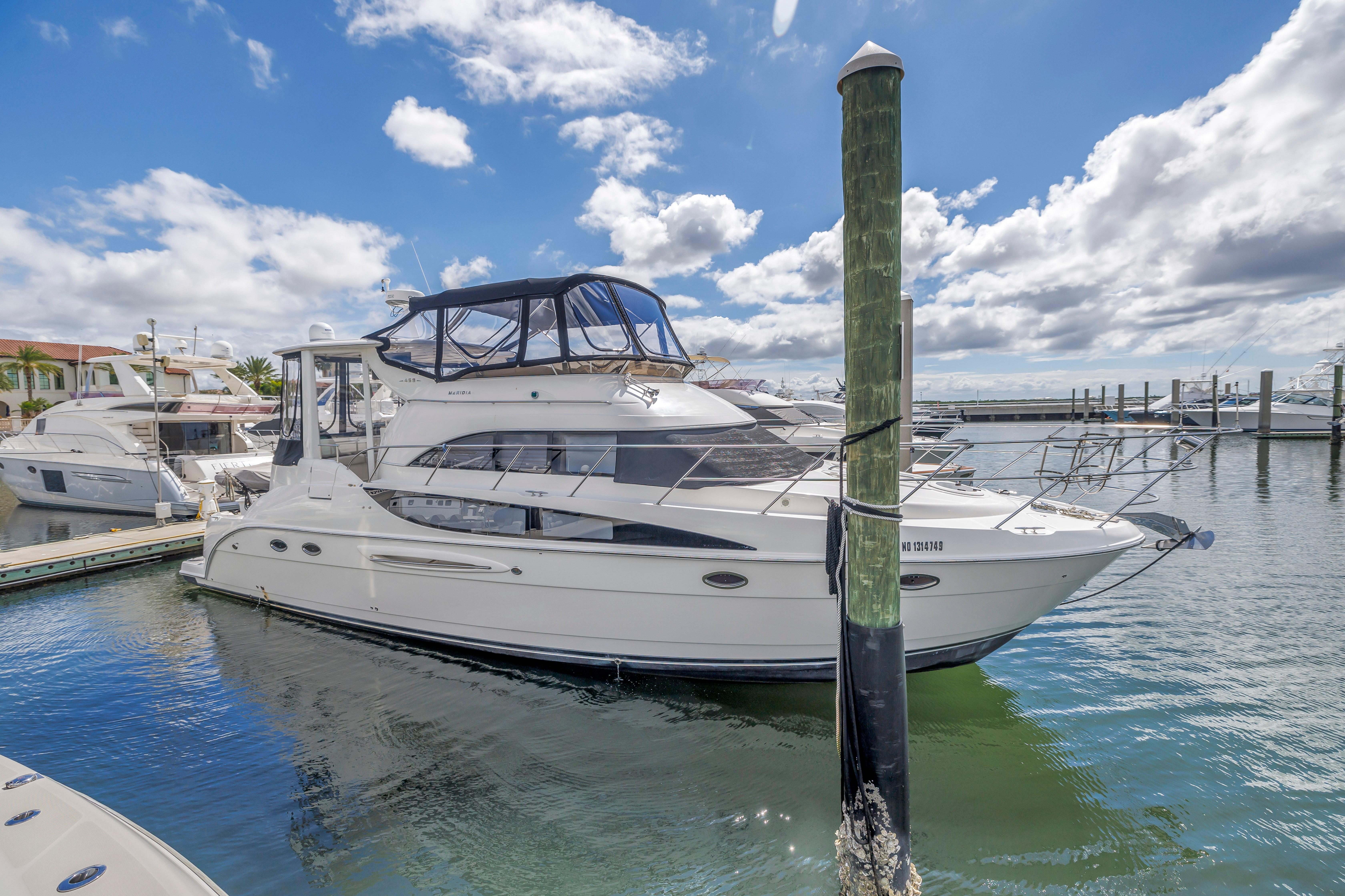 The 459 Motoryacht's attractive design succeeds at every level. To start, she offers superior cruisability for a family while providing the extra measure of privacy that owners crave. Her guest stateroom is located forward with its own private head facilities, while the full-beam master stateroom with its en-suite head and shower is aft. Best of all, this luxurious master suite boasts private access to the spacious cockpit through large sliding glass doors. The 459 is also thoughtfully designed for entertaining, offering well-appointed bridge and aft decks, plenty of natural light and fresh breezes in her interior spaces and outstanding views from the generous salon. Meridian understands all the things that are important on a cruising yacht. Let your cruising celebration begin.