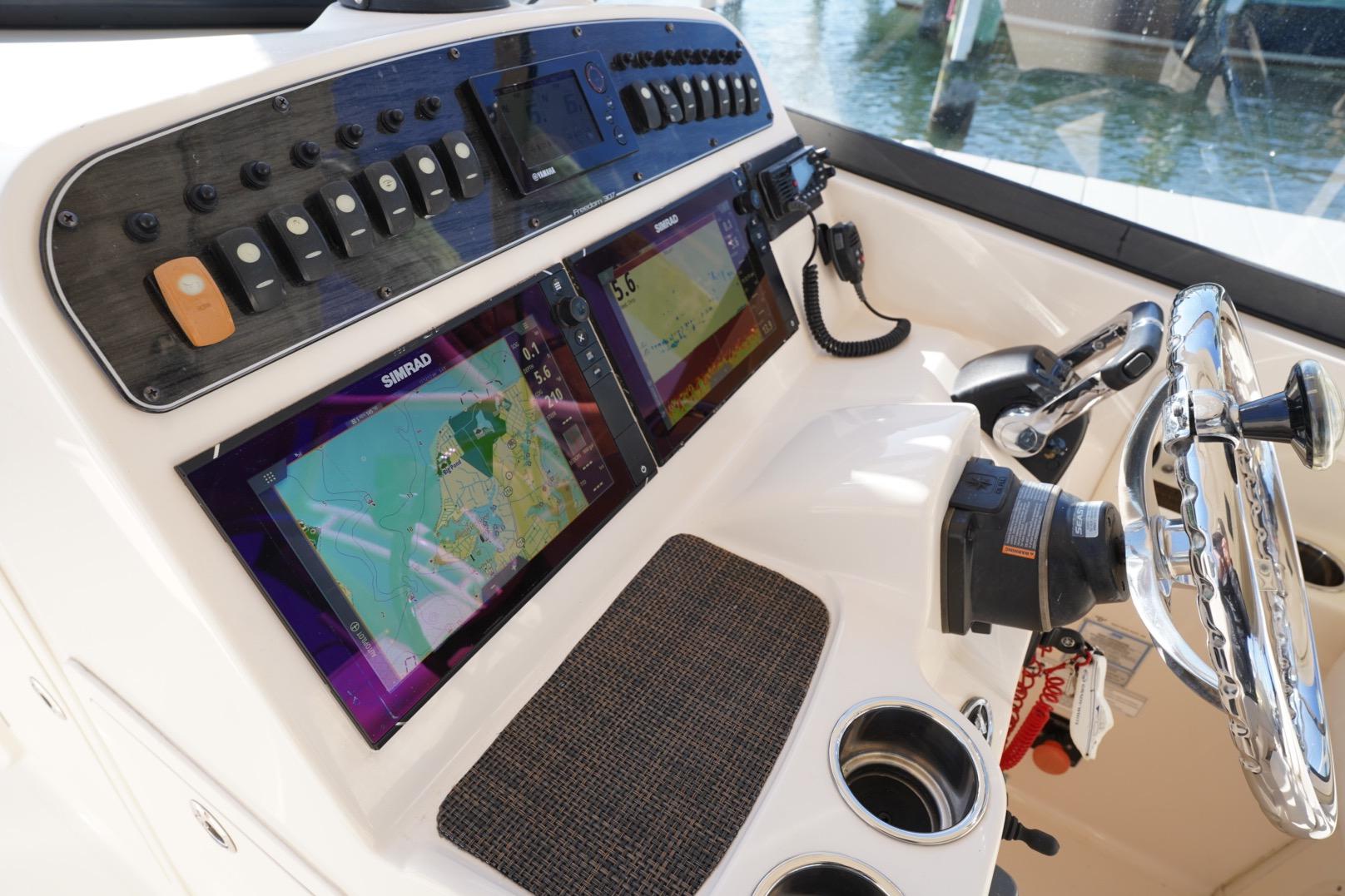 Beautifully kept Freedom 307 used exclusively as the tender to a larger yacht and maintained by a full-time captain. Powered by twin Yamaha F300s with just 495 hours, this boat is turnkey and loaded with desirable options. Features include dual SIMRAD GPS units, electric SureShade, cockpit and bow covers, upgraded stereo, windlass, large livewell, enclosed head, and Grady-White’s exceptional dual-console layout. “Starr” shows above-average care in all areas and is ready for family cruising, fishing, or tender service.