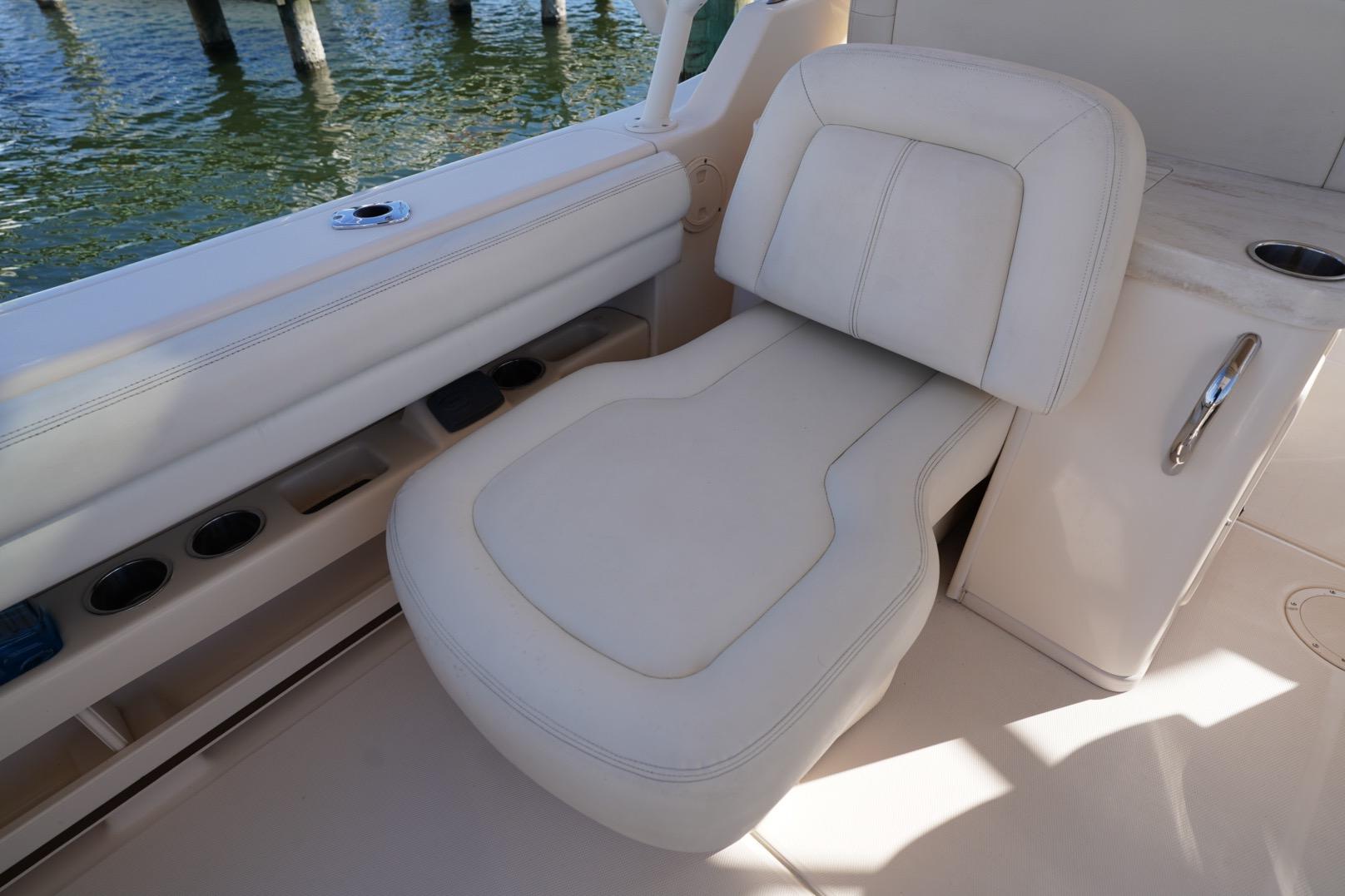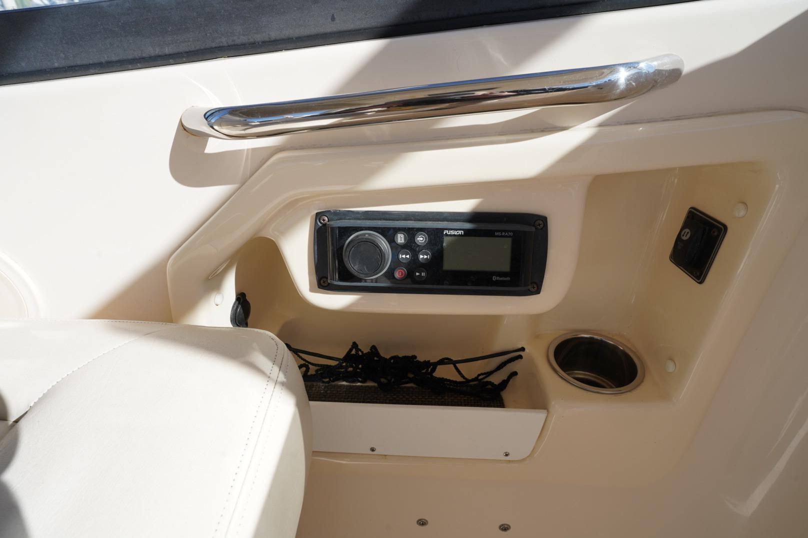 - Wet bar w/sink, storage drawers, trash bin, drink holders (2) & fire extinguisher holder (integrated with electronically adjustable helm seat)