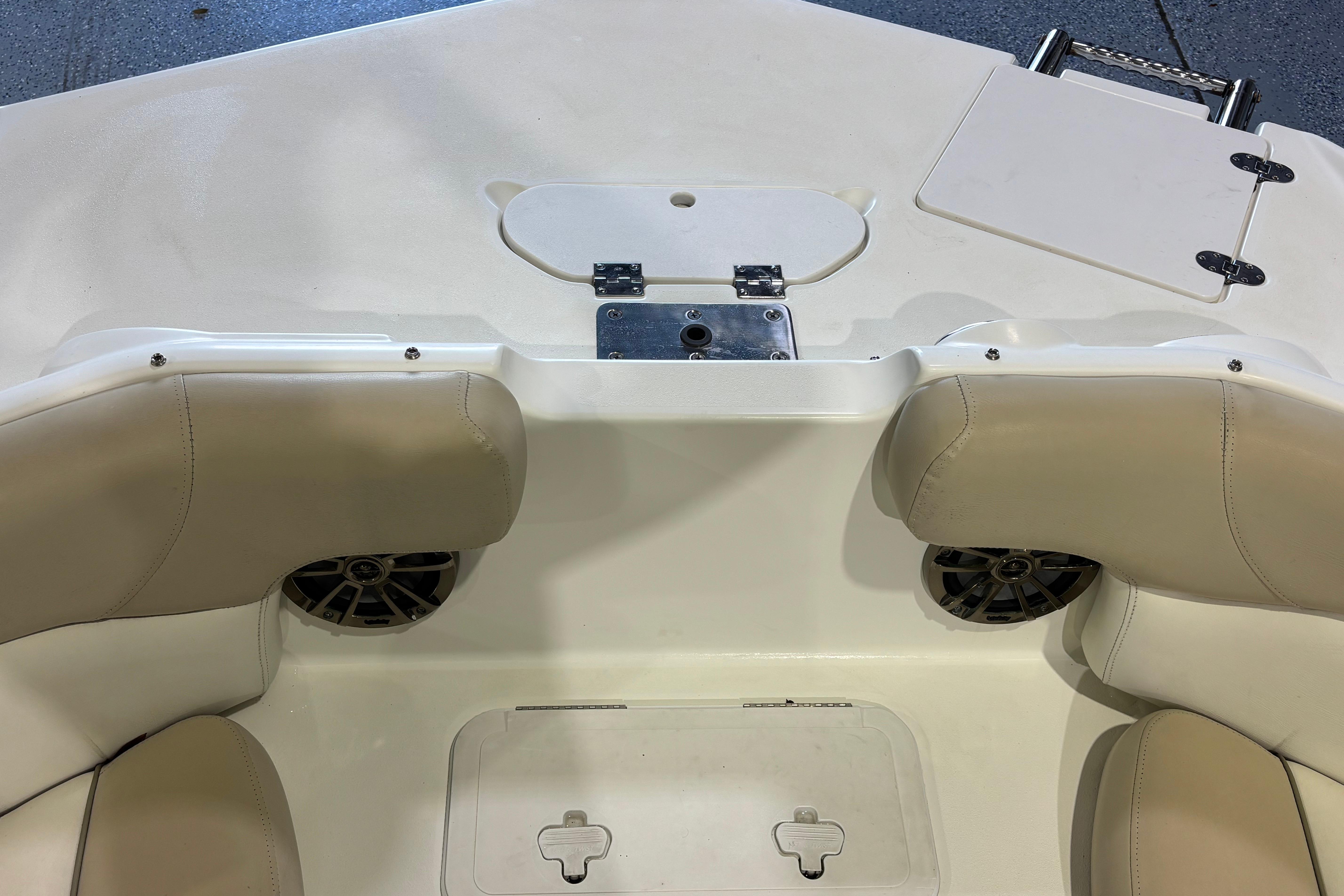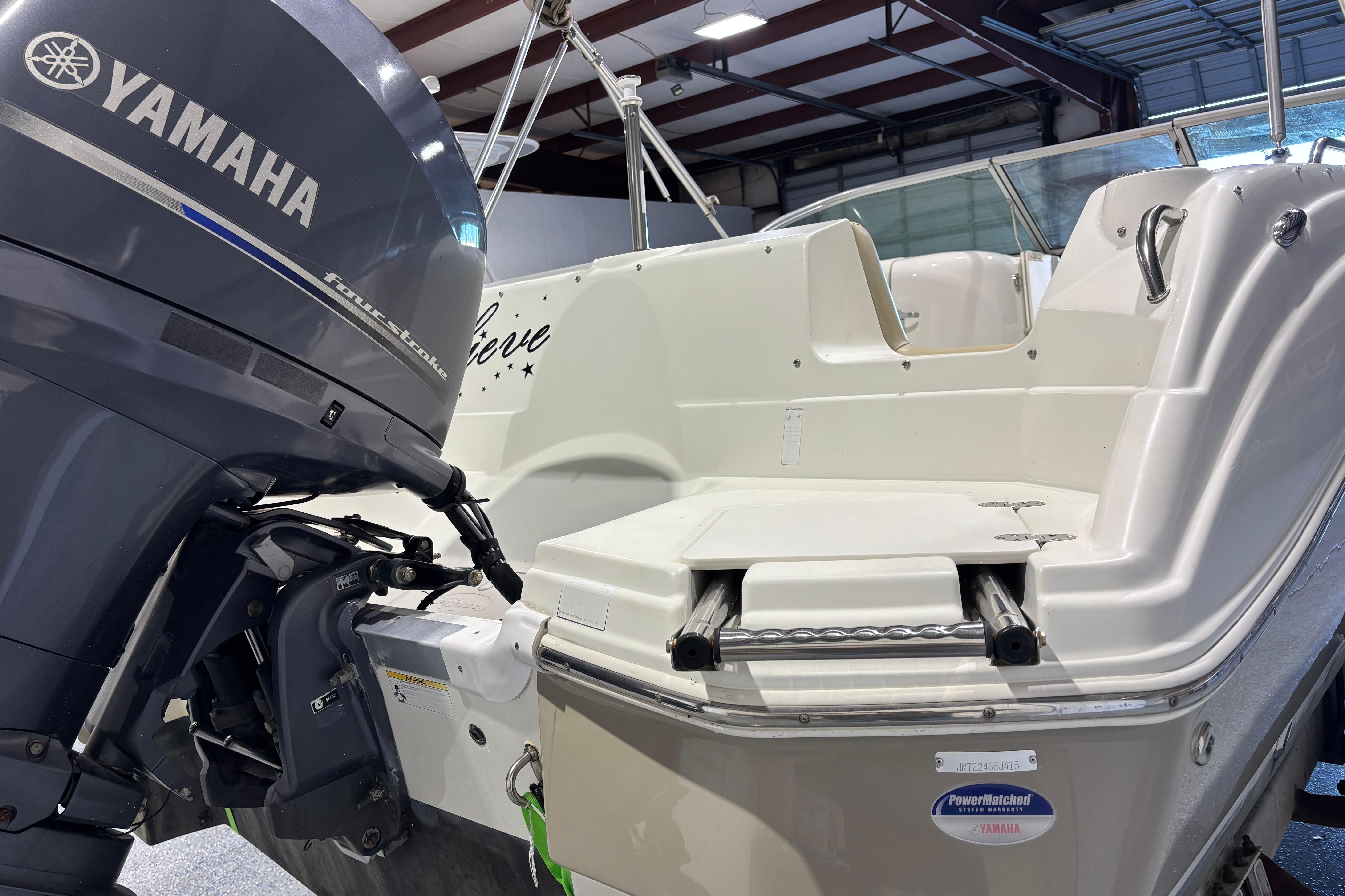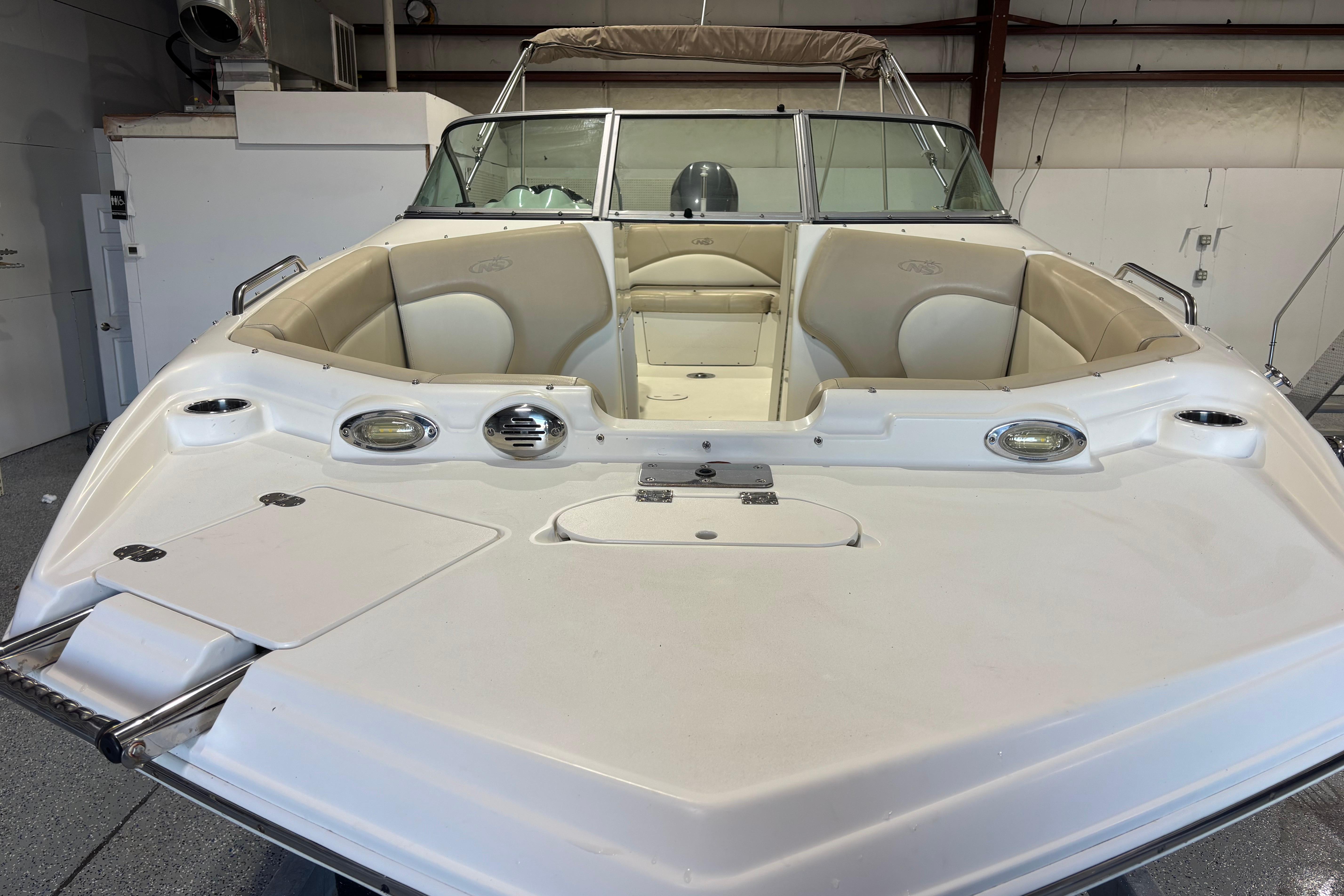 Enjoy the drive and ride of a V-Hull and beach party capacity of a Deck Style boat with the 223 DC. Convenience and comfort features include a Panoramic wrap around walk thru windshield, Portside mid ship enclosed Dressing Room, and “leather touch upholstery”. Some of the construction and design features include 11 drink holders, 7 storage compartments and 100% wood free construction. You will show up to the beach party in comfort and style in the 223 DC.