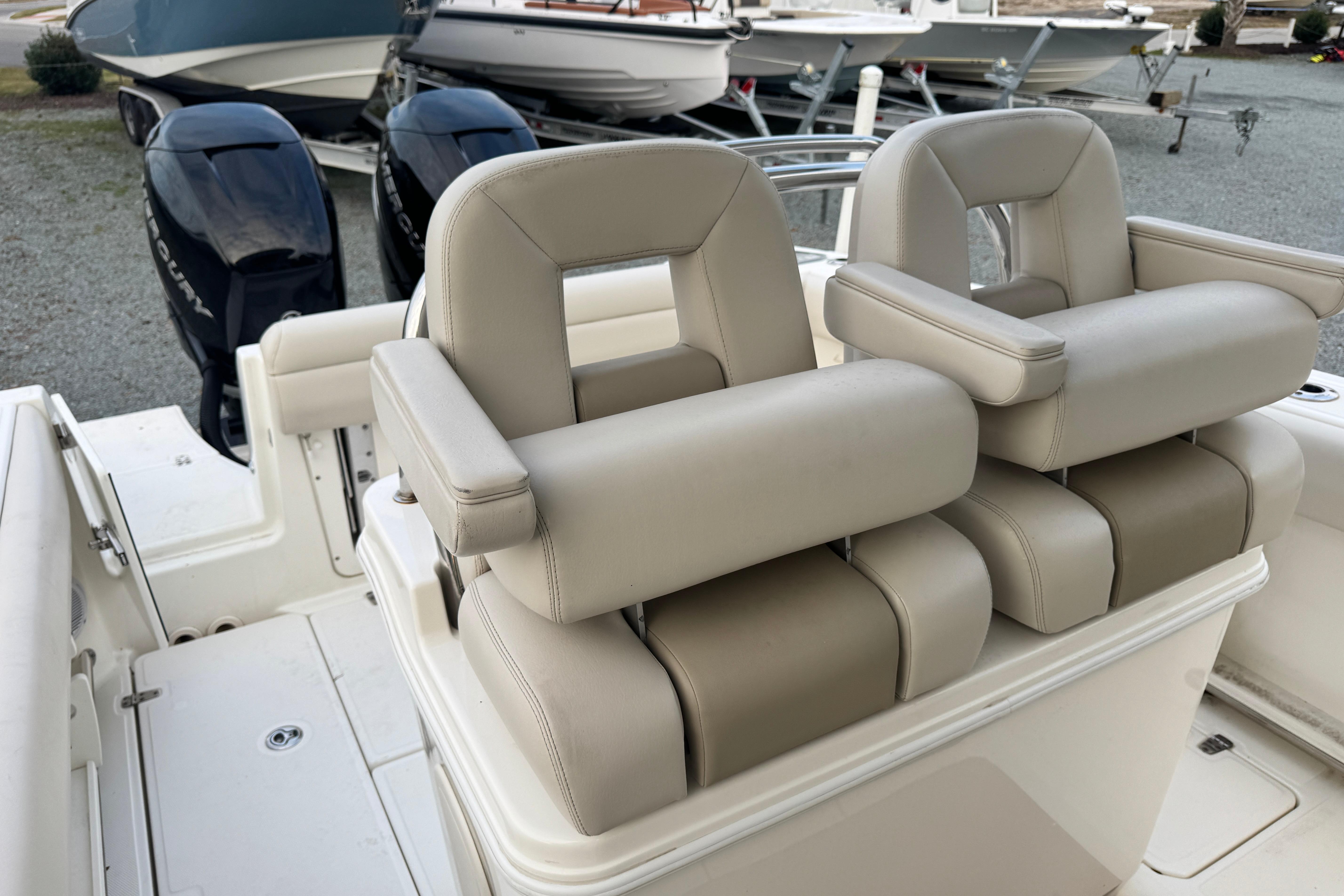 - Deluxe helm seat upgrade provides adjustable captain’s chair and stationary companion seat.