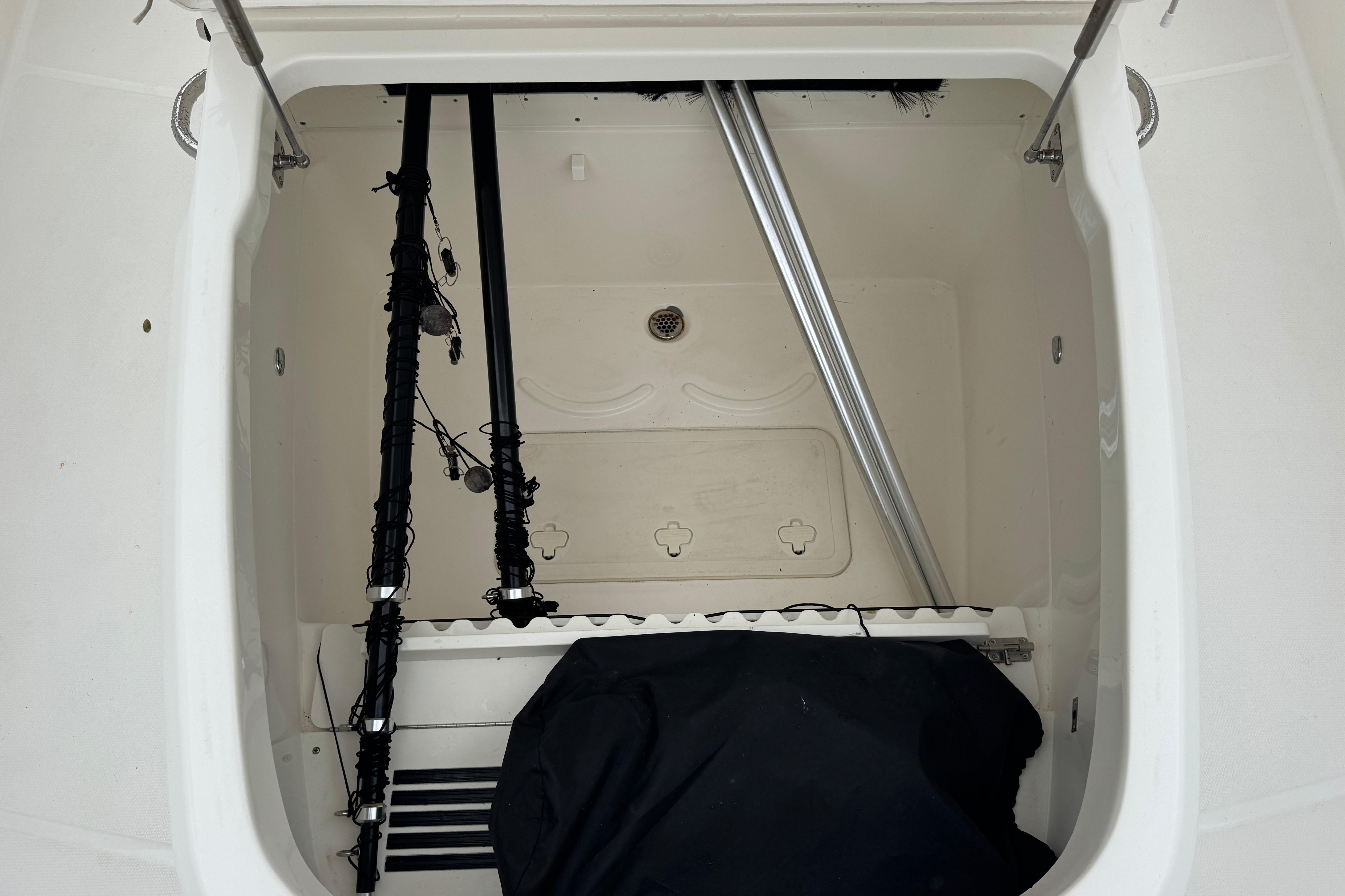 - Port aft storage at fishing prep area (can store a 5 gallon bucket)