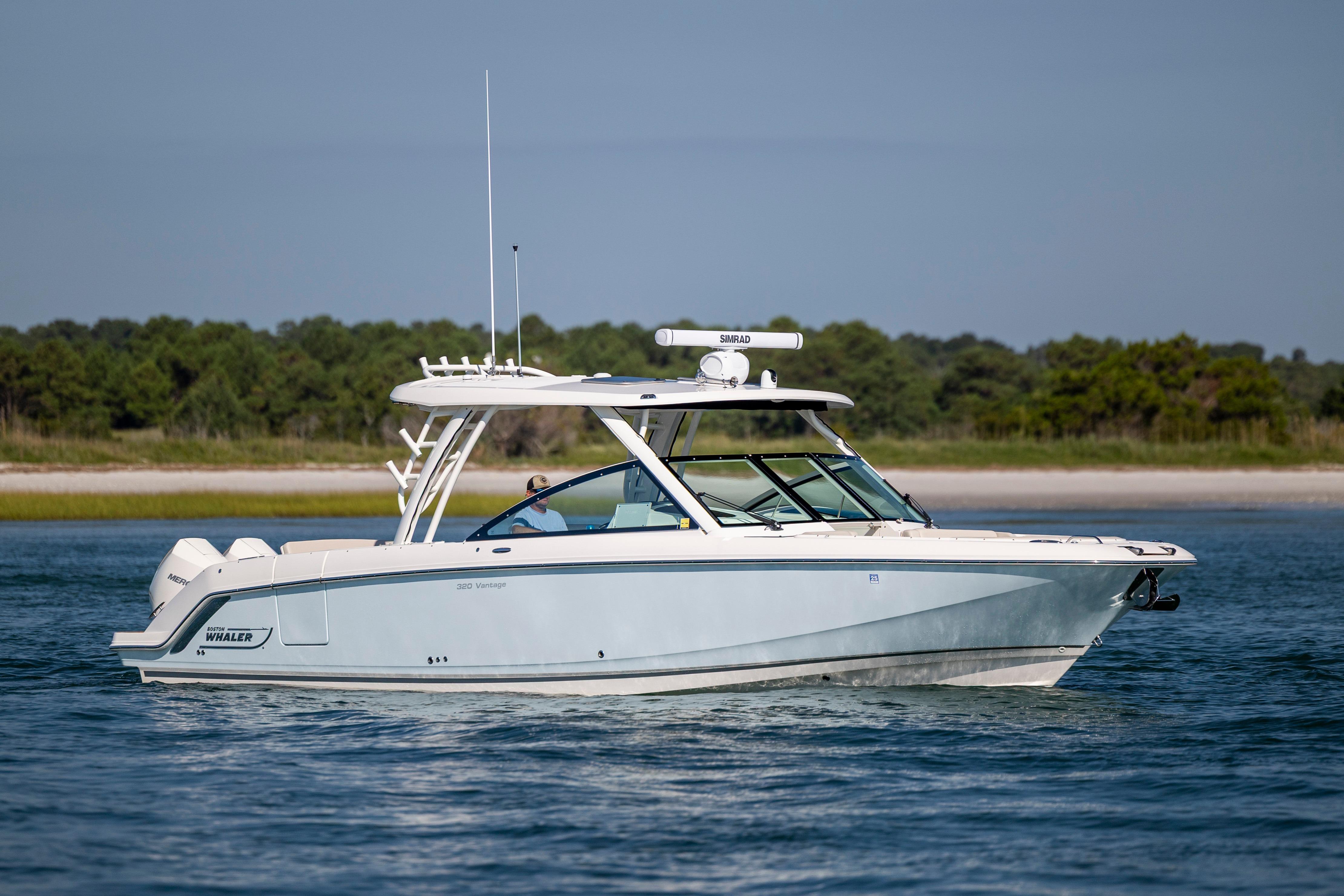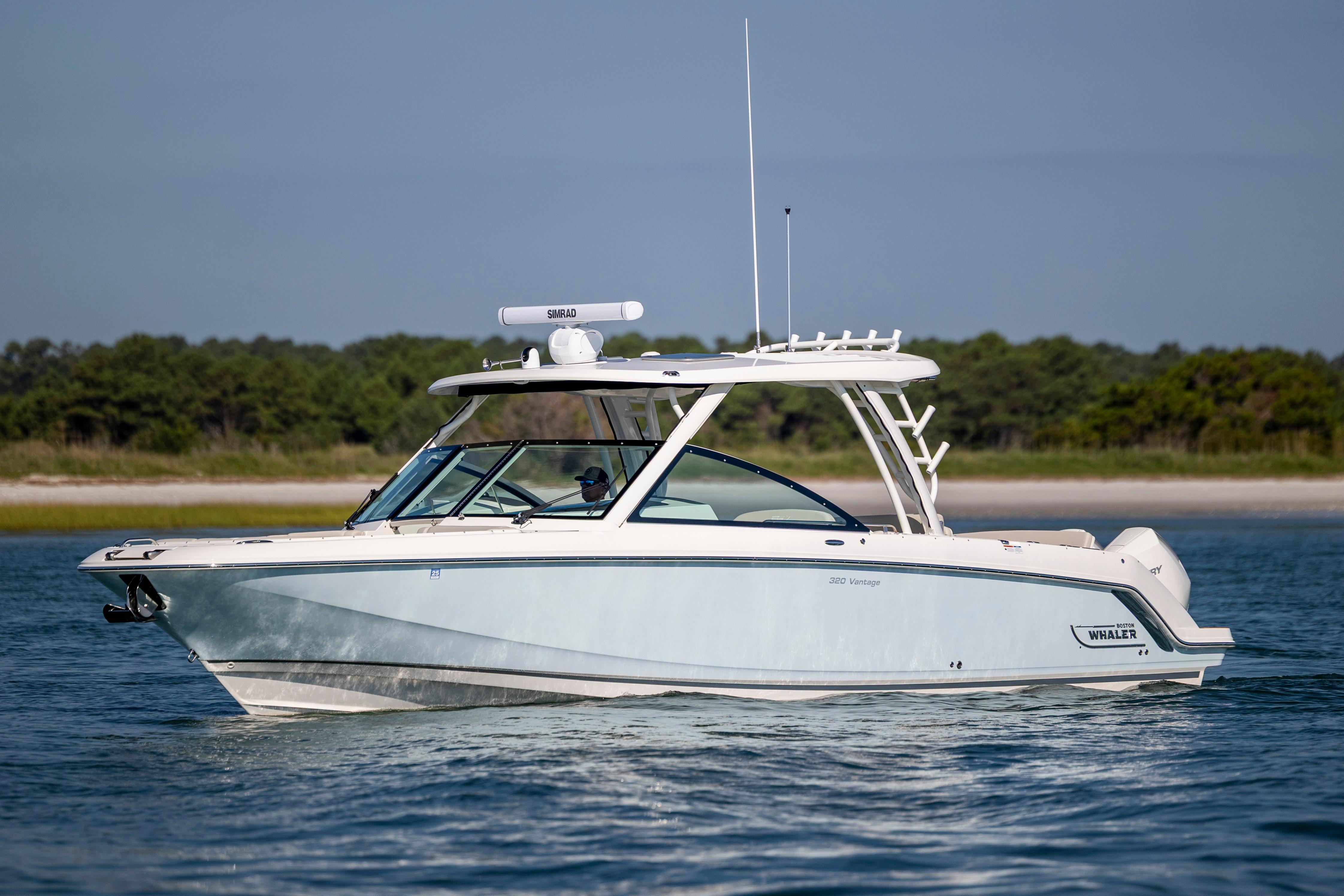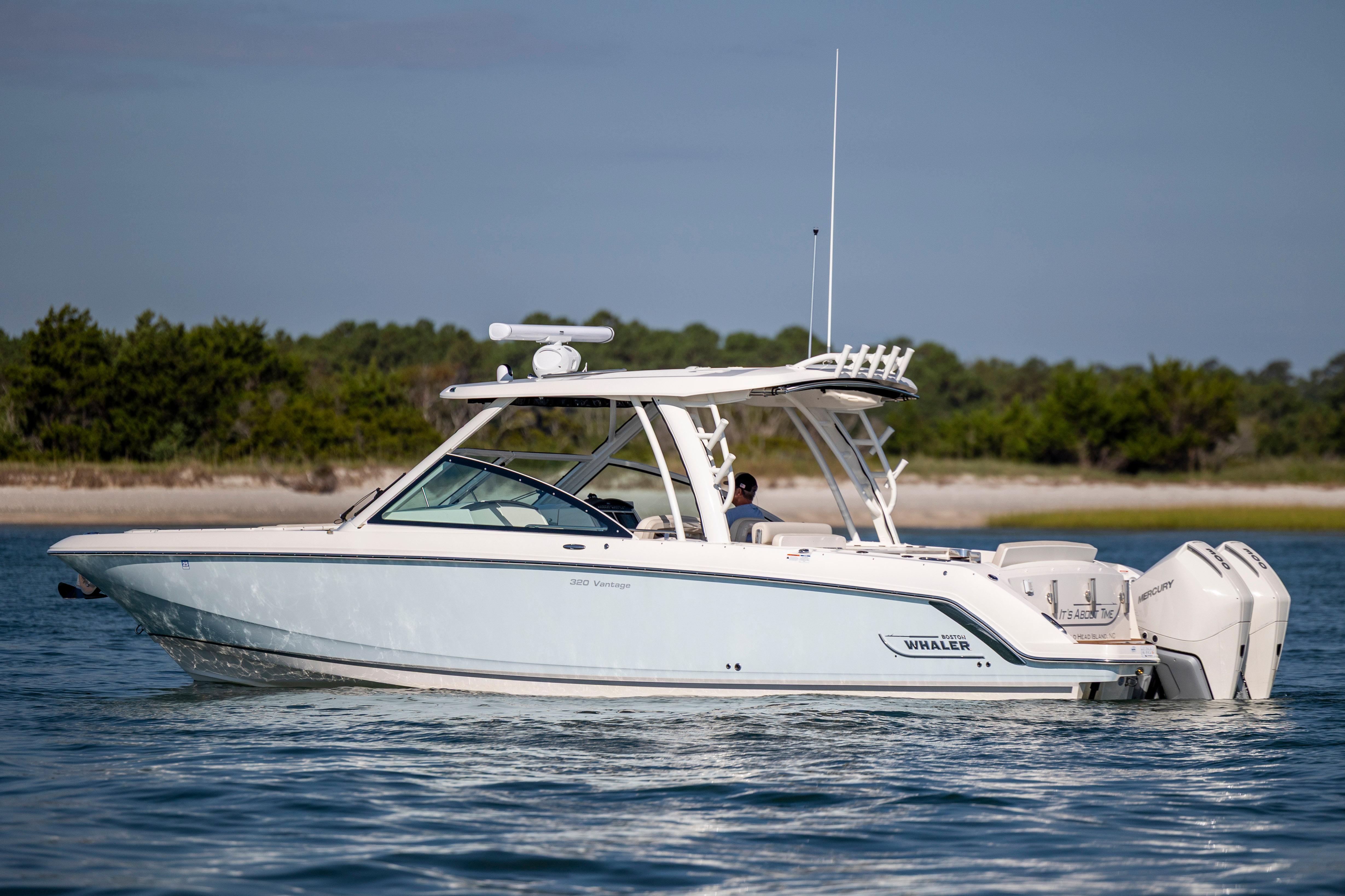 Cutting-edge features, great capacity and easy adaptability are hallmarks of the dual-console 320 Vantage®, winner of the National Marine Manufacturers Association's Innovation Award for it's convertible seating. Rock-solid control meets the ultimate in versatility and comfort with the many accessories and options the 320 provides. Serious fishing, joyful entertaining, day-long watersports or cruising and even a place to sneak in a nap or an overnight stay, the 320 is ready for your day. When the softest, safest ride meets the best equipped dual-console around, new possibilities become eminently possible. With Whaler, you can be confident to the core.