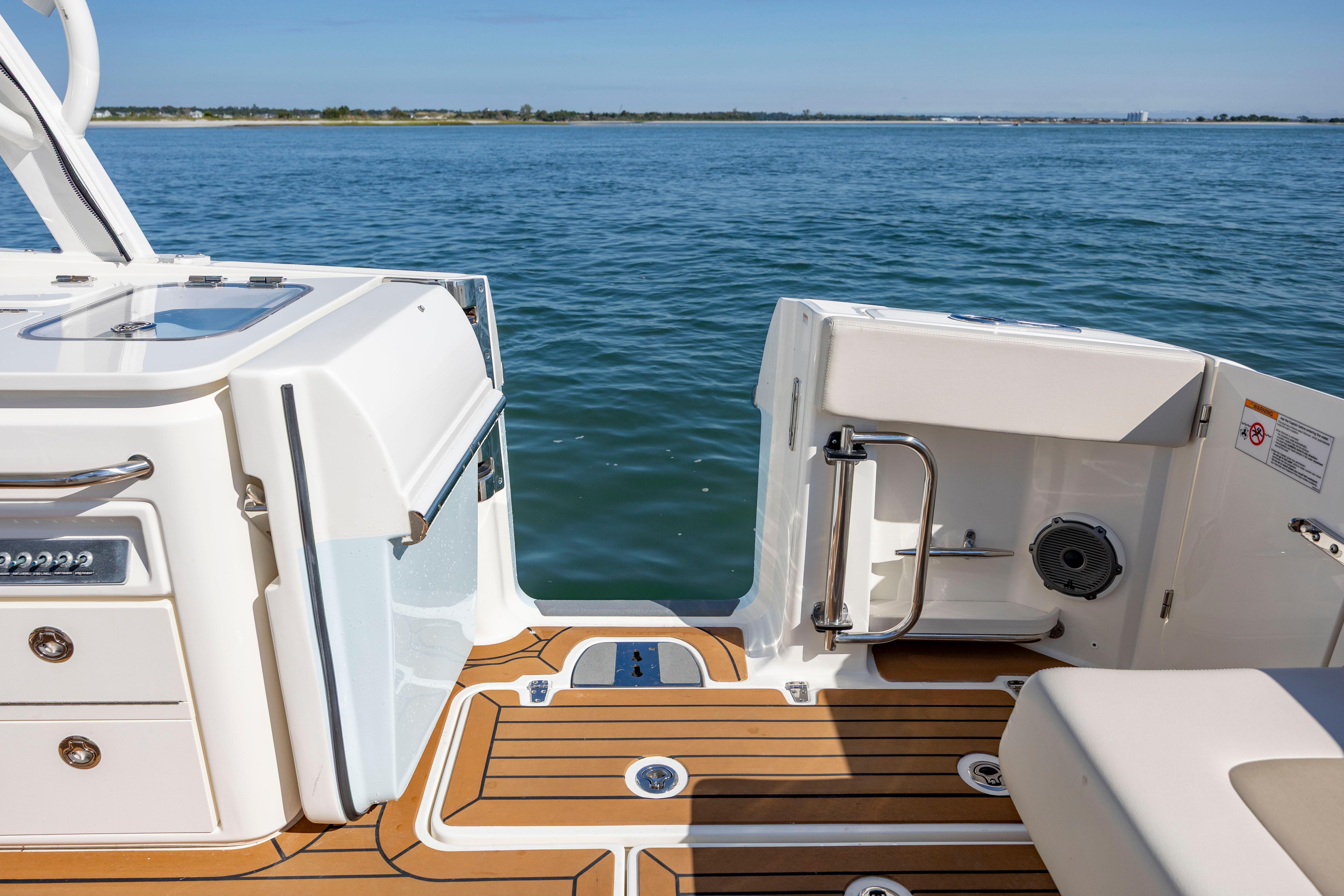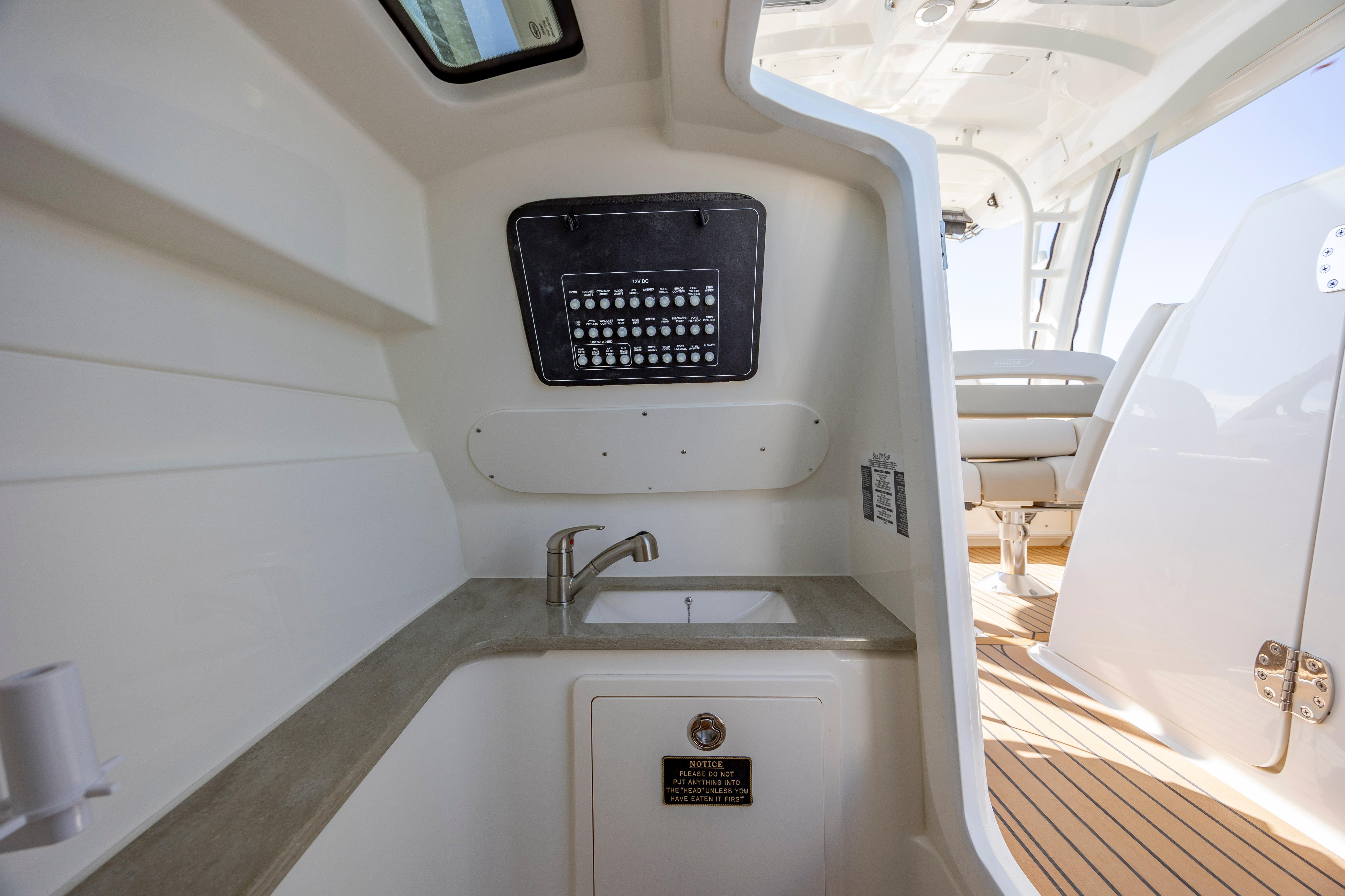 - A cockpit utility center includes a sink, 18-gallon cooler and prep surface, plus optional grill and fridge.