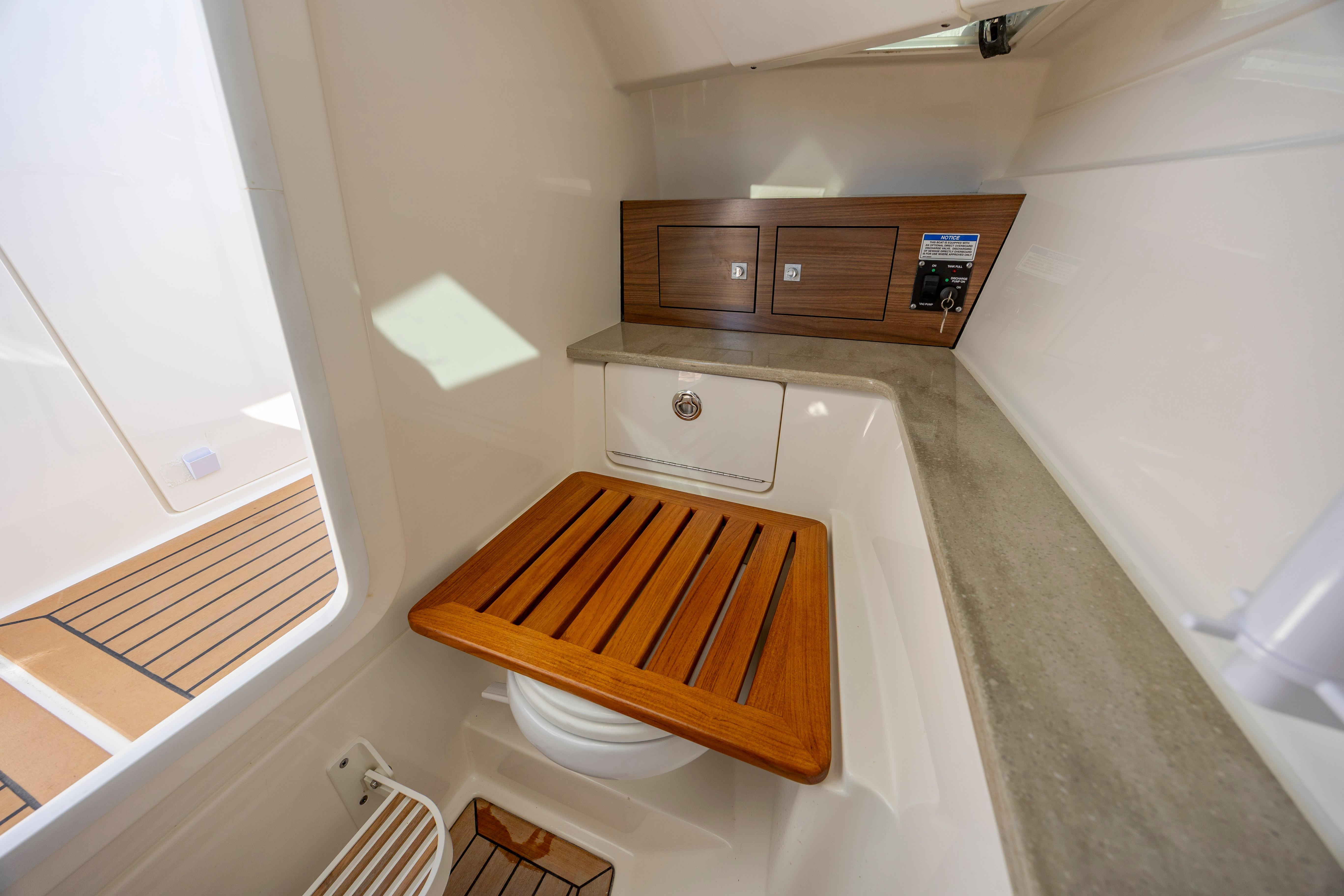 - Porcelain VacuFlush® toilet, holding tank, overboard discharge, and dockside pump-out