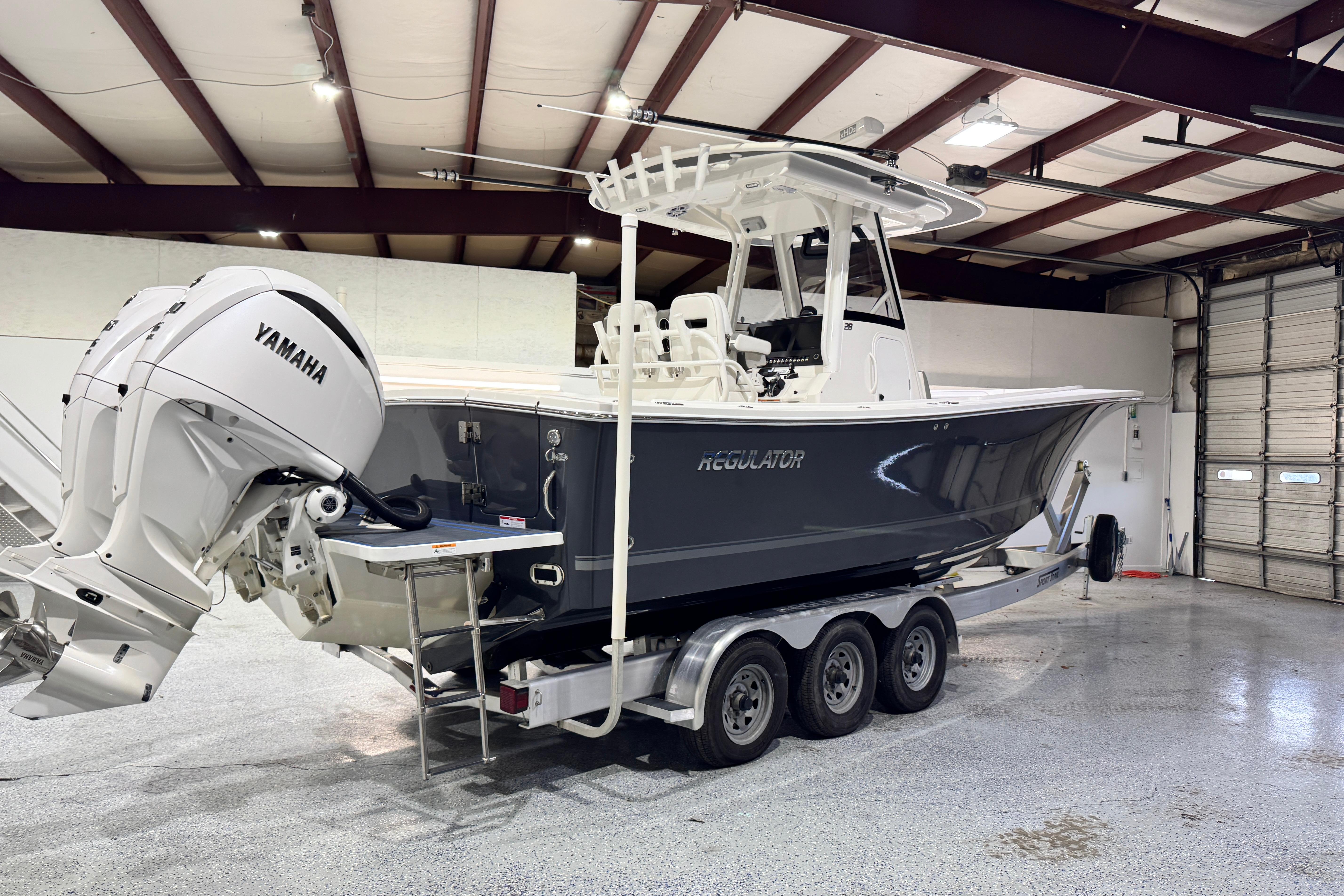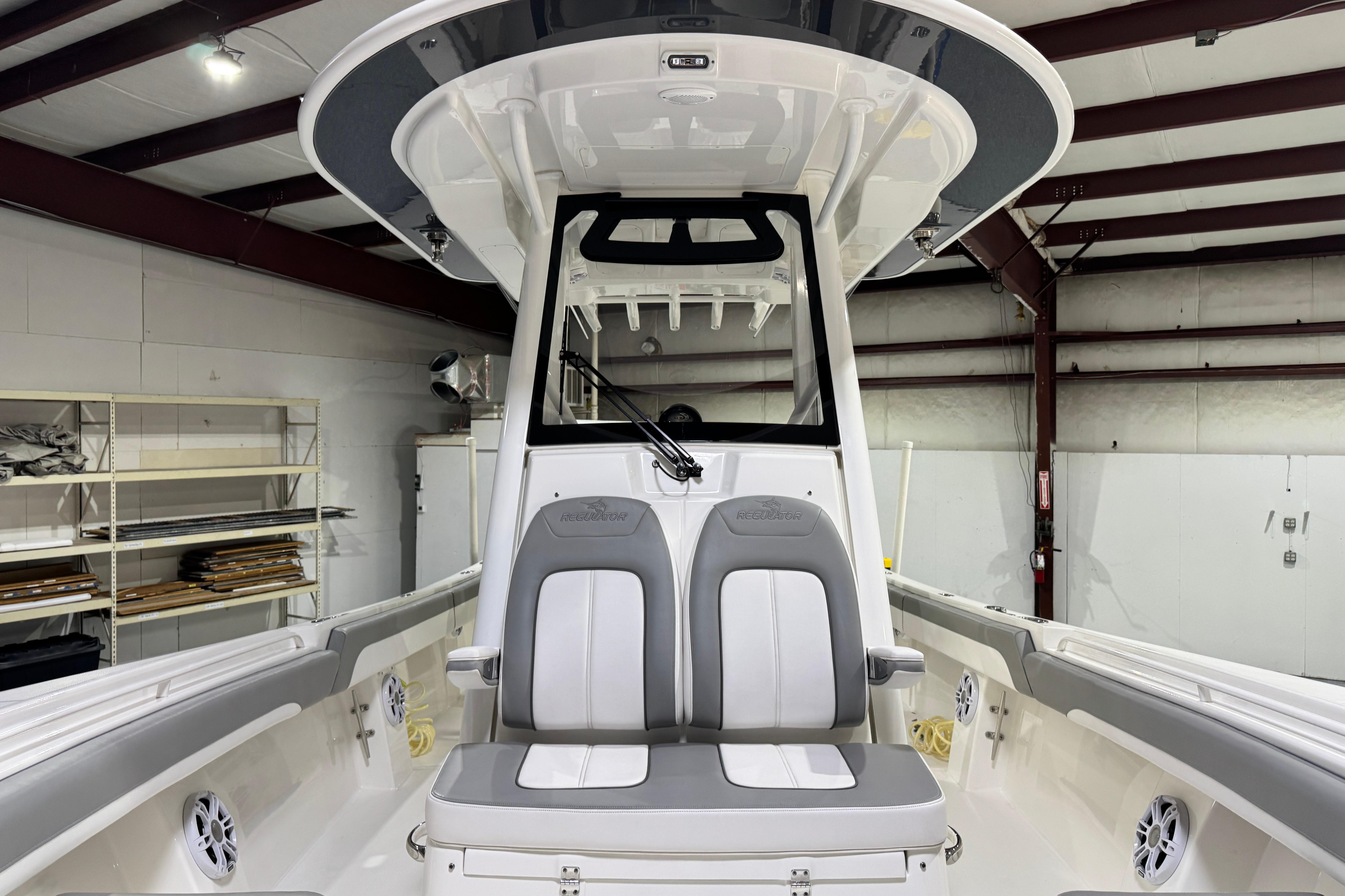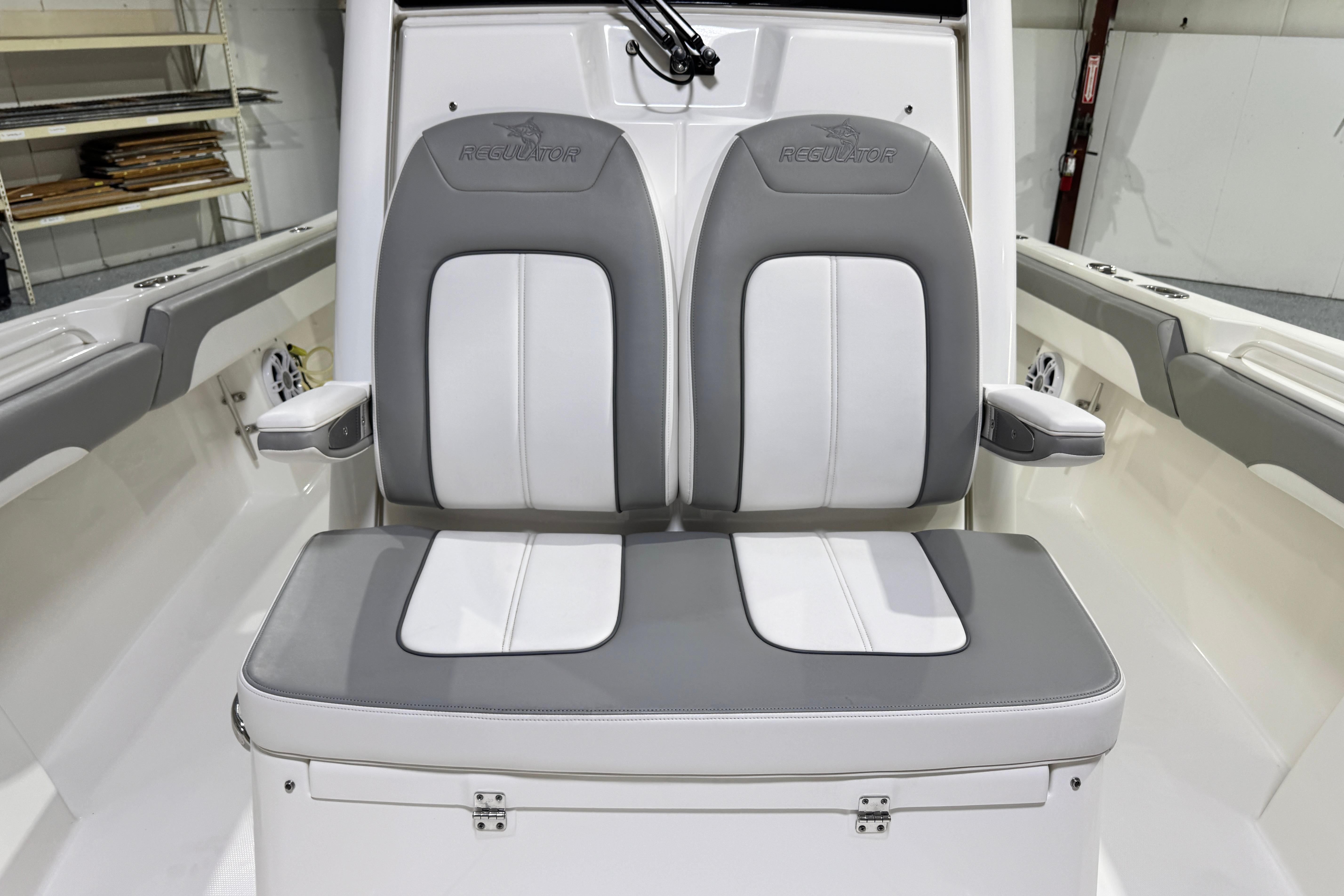 Step up performance with a fishing machine built for offshore action. With its sharp bow entry and Lou Codega-designed hull, Regulator’s signature ride comes standard. The new Yamaha Helm Master® EX option delivers AutoPilot with Waypoint Deceleration, allowing you to slow your approach and shift easily to Multimode Set Point™ - a seamless integration that makes it easier than ever to maintain your position for rigging baits and more. Our 28 Tackle Center, seatback rod holders, optional T-Top rocket launchers, and Taco® Grand Slam outrigger upgrade create an ideal rigging station for a group of anglers looking for offshore action. The transom walkthrough tuna door provides flexibility for both boarding and fishing, with our flip-up forward seat backrests, optional forward sun shade, and cockpit SureShade® and 28 sunbed table adding an extra degree of comfort as you pursue the Offshore Life.