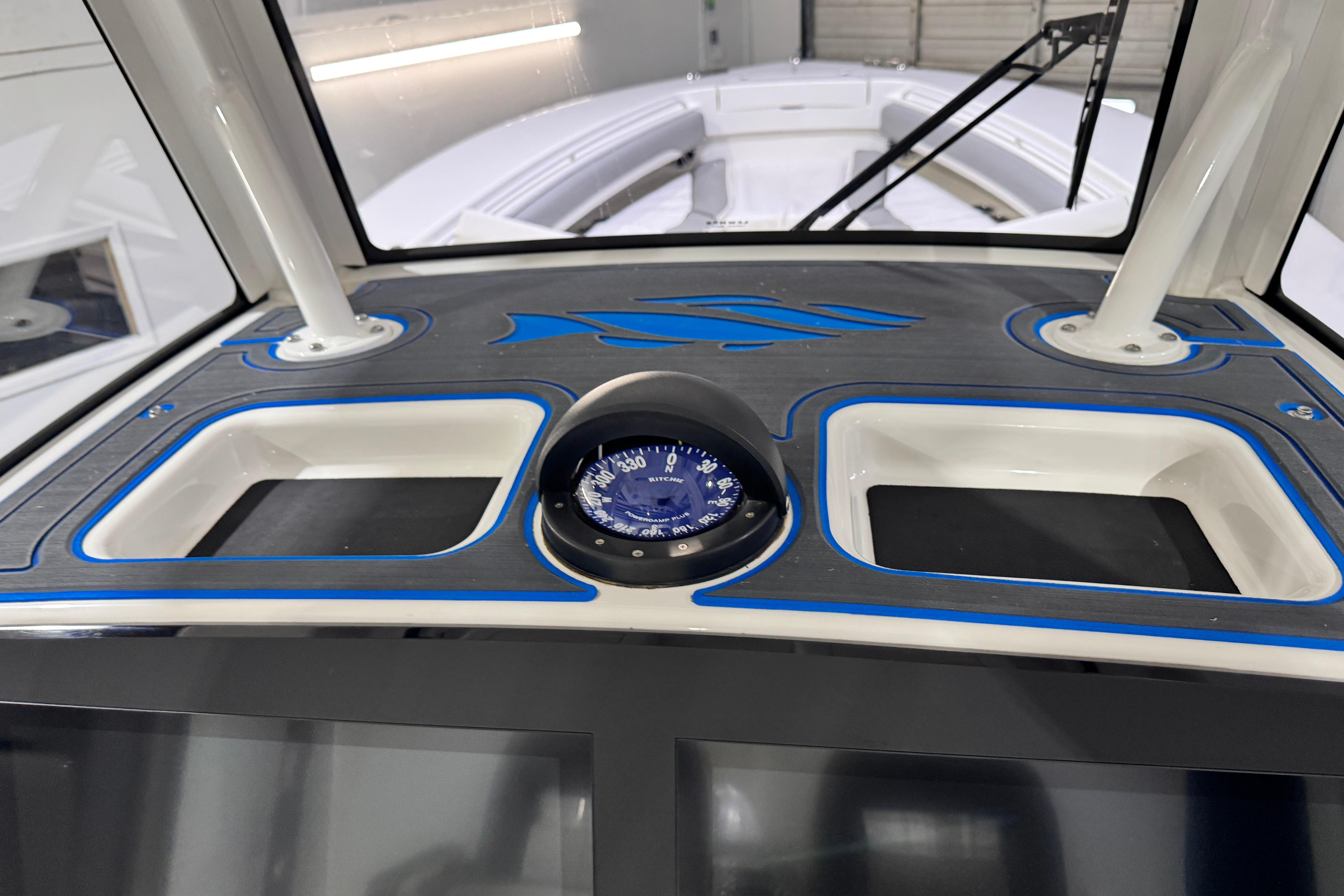 - Fiberglass T-Top with Surfboard Edges, Electronics Box, Spreader Lights, and Multi-Colored LED Lights – Complete with Integrated Wraparound Windshield with Vent and Windshield Wiper/Washer