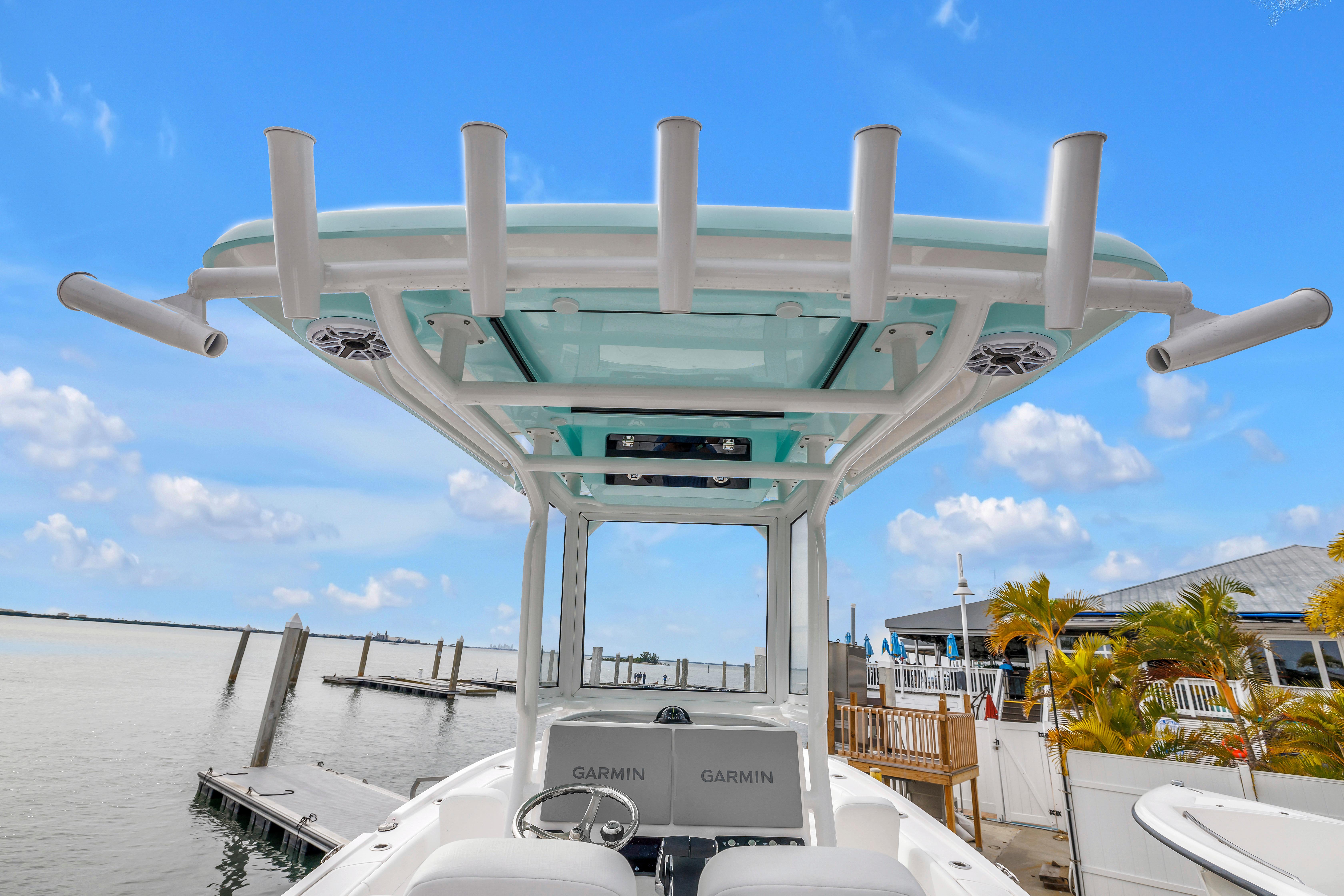 - Pro series color-matched fiberglass leaning post with custom flip-up bolster seats and backrest, four (4) rod holders and two