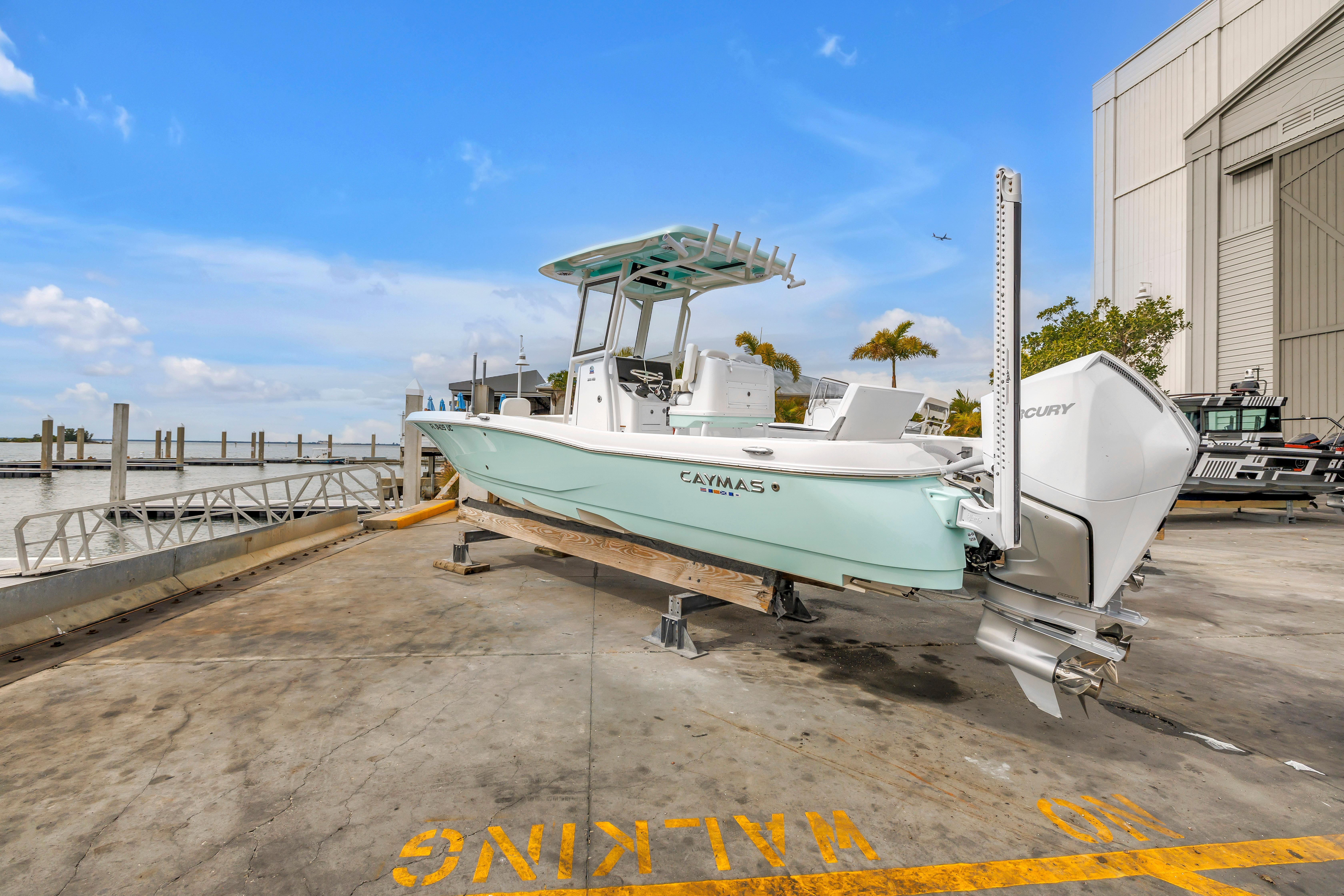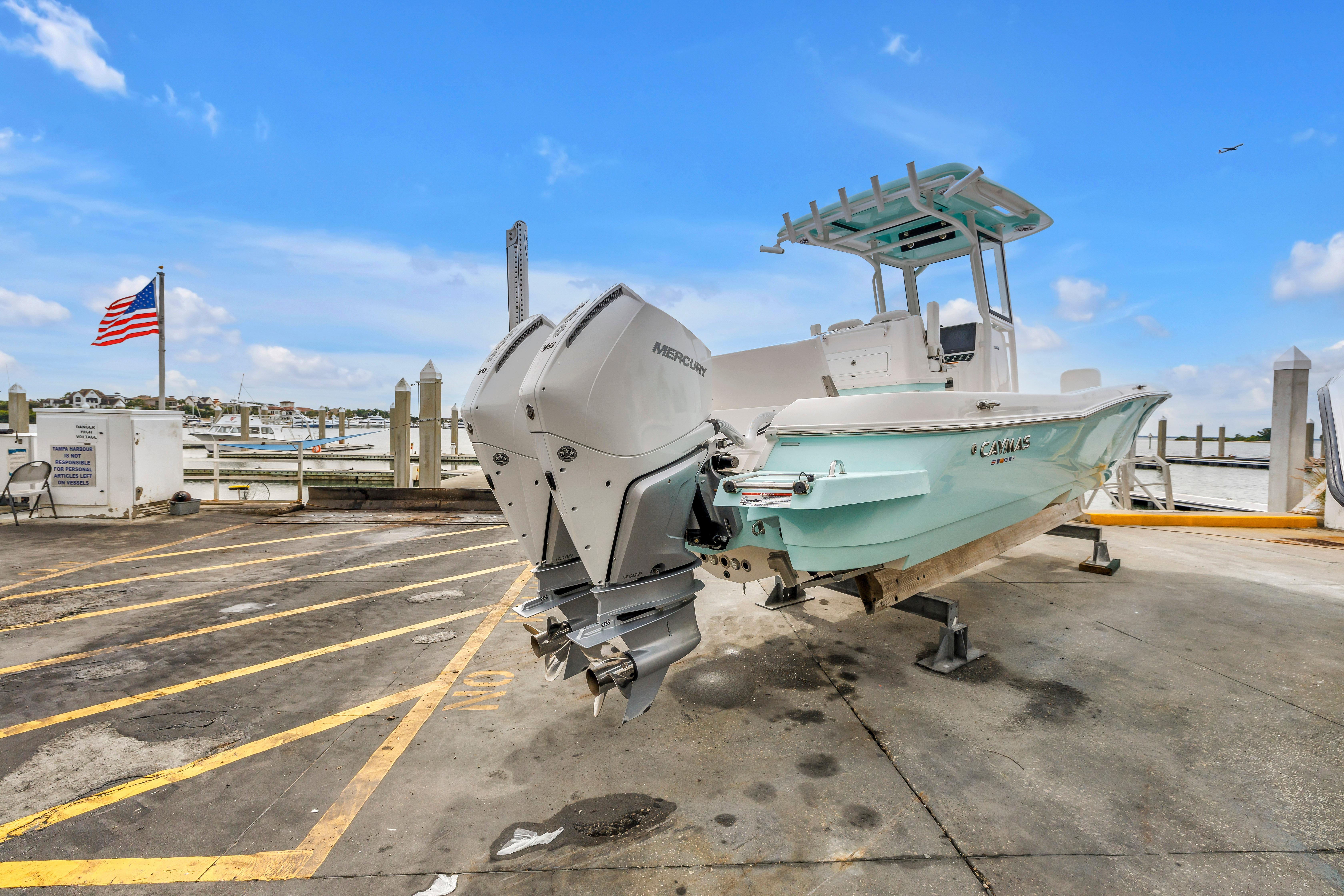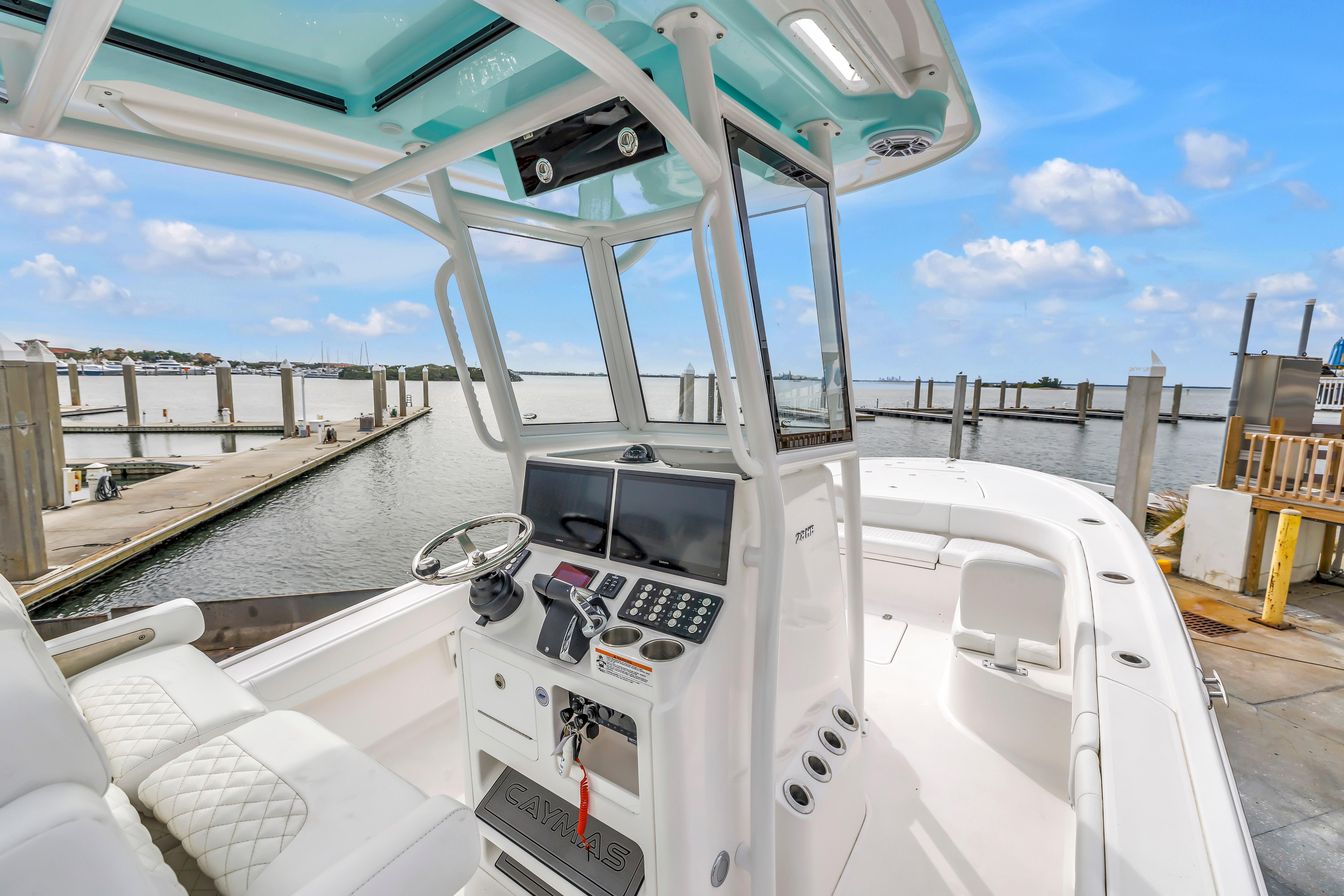The Caymas 28HB is a perfect combination of pro-level fishability, distinctive contemporary styling, and family-focused comfort. Performance starts with a Michael Peters Stepped-Vee Ventilated Tunnel Hull. This patented hull delivers speed, fuel efficiency, and a precise and dry ride. Serious anglers will appreciate the 28HB’s huge nonskid casting deck, massive built-in storage compartments for tackle and gear, 35 gallon aerated live wells and baitwell, backlit console display and a 120-gallon fuel tank for maximum range. Family and friends who hop aboard for the day of fun will love the 28HB cushioned seating at bow and stern, extra elbow room afforded by the boat’s 9’4” beam, the combination of high freeboard and deep gunnels for added safety and security, a rocking stereo system and a “butter-soft’ ride. See for yourself how the Caymas 28HP enjoys the best marine fit and finish utilizing the highest quality marine hardware and craftsmanship.